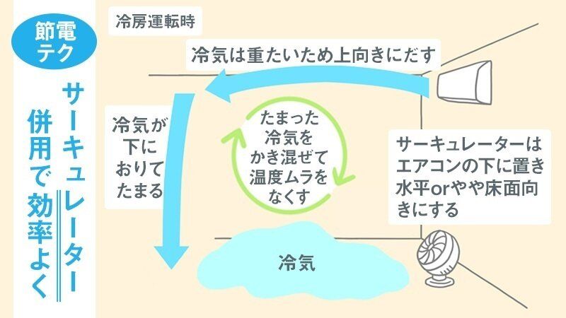 冷風は下に溜まるので、サーキュレーターや扇風機をエアコンの下に置いて、水平もしくはやや床面向きにおいて空気を循環させてください。下に置けない場合は、エアコンの対面から斜め上に向けて、エアコンの冷風をうまく攪拌させることをおすすめします。部屋全体の温度を均一にすることで、体感温度を下げて、エアコンの設定温度を上げる事ができますよ。