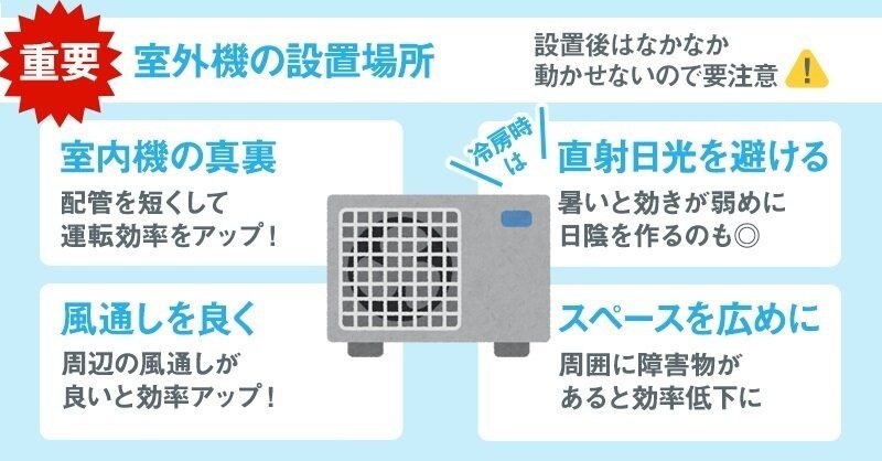 また、室外機の置場所も重要です。できる限り直射日光が当たらない場所に、前方、左右と3方向は開放しておくことがおススメです。室外機の周囲に植木鉢などを置いてないか確認してください。