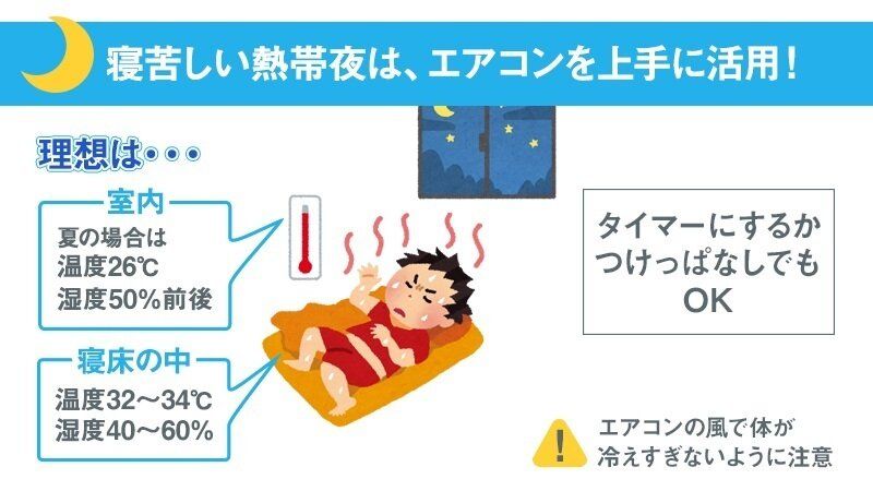 また、妻のほうに冷風が直接当たらないように調整したり、妻はパジャマを長袖にする、上にかける寝具の厚さを夫婦で変える、という方法もいいでしょう(気温30℃を超えるような時は、室温を下げることを優先する冷房運転をおすすめします)。