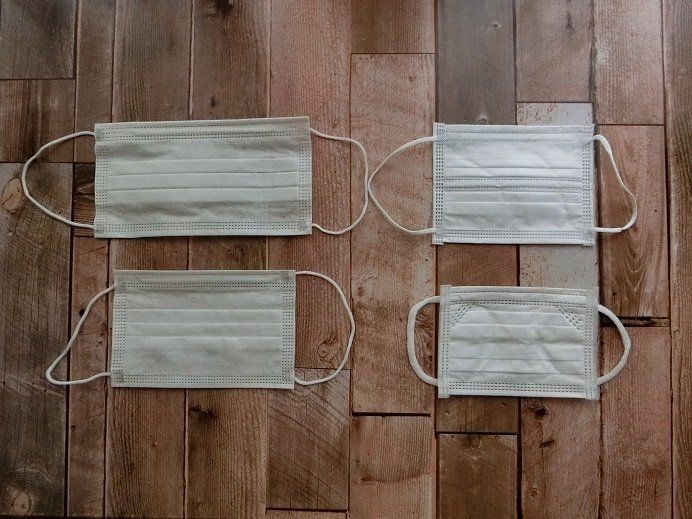 わが家にあったマスクを並べてみると、大人用、女性用、子ども用と大きさはそれぞれ違い、さらに右側2枚はどちらも子ども用ですが大きさが違いました。
