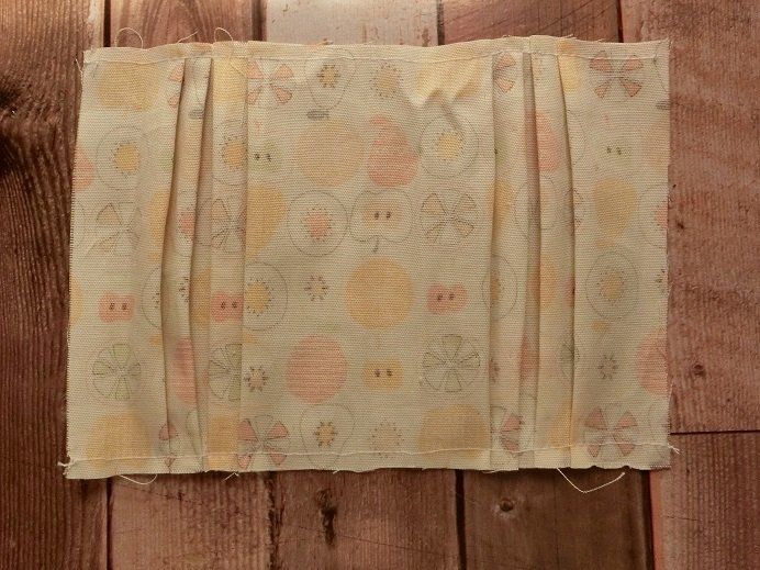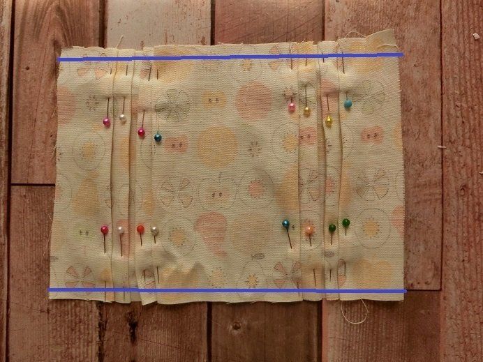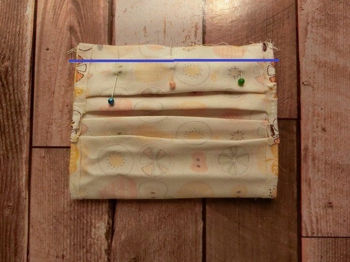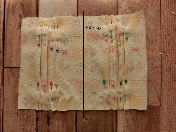 布の中心がわかるように印をつけます。マスクを横に並べておいて、マスクと同じ位置にプリーツができるように止めます。本当は上から何cmのところを谷折り、山折りとするんだと思いますが、マスクと同じものができればOKと思って、測らずに止めました。