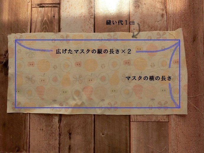 サイズはマスクの横の長さと、広げたマスクの縦の長さを2倍にした大きさ。これに縫い代1cmをたして布を切ります。