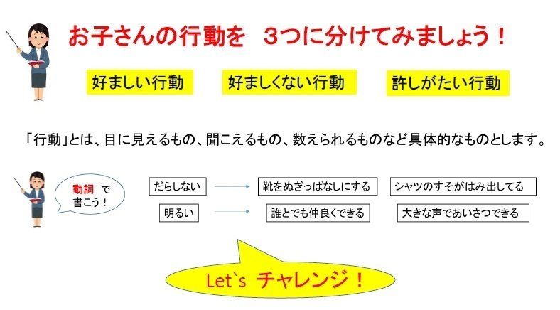 「親にとっての好ましくない行動」と考えるとイライラしますが、「子どもの成長にとって好ましくない行動」と考えたら、子どものためにも行動を減らしていくことが大事!と思えますよね。