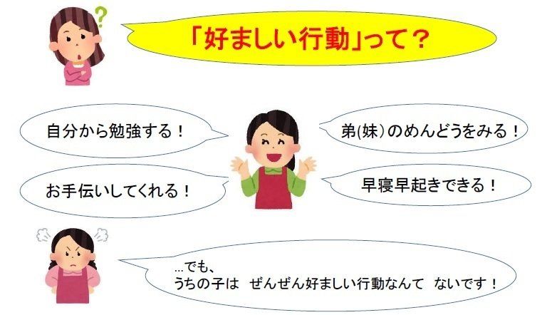 では、お子さんはそれができてますか?と聞くと「できてません!だからほめられません!」と怒りの声が。しかし、そもそも「好ましい行動」とはなんでしょうか?