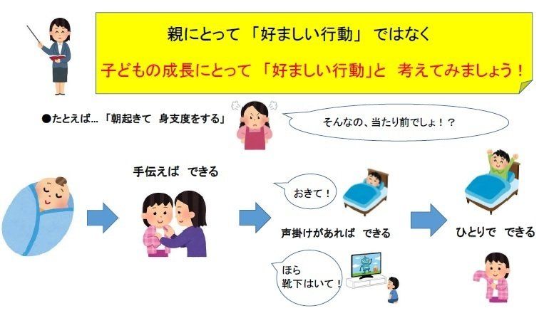 ペアレントプログラムでは、好ましい行動とは、「親にとっての好ましい行動」ではなく「子どもの成長にとって好ましい行動」と考えます。