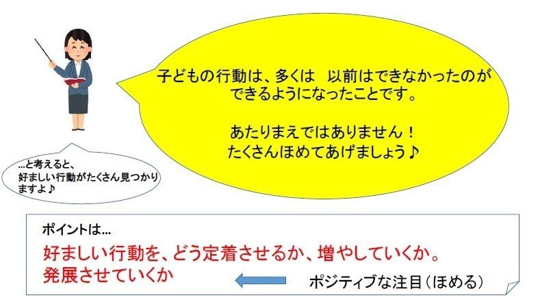 そこの成長を見落とさずにほめていくことで、好ましい行動は増え、定着していき、そして次のステップに発展していきます。