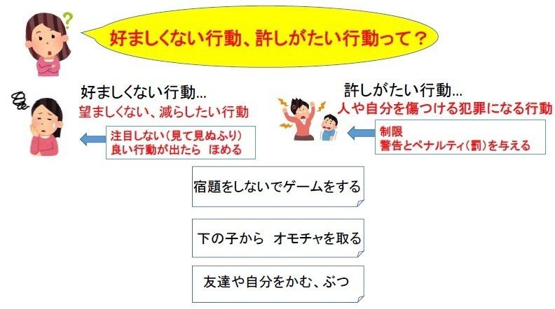 実は、それ以外はほとんどが「好ましくない行動」に分類されます。宿題をしないでゲームをする……これは、親にとっては「許しがたい行動」に感じるかもしれませんが、子どもにとっては「そこまでではないけど、減らしたりあらためたりしたほうがよい行動」となるのです。