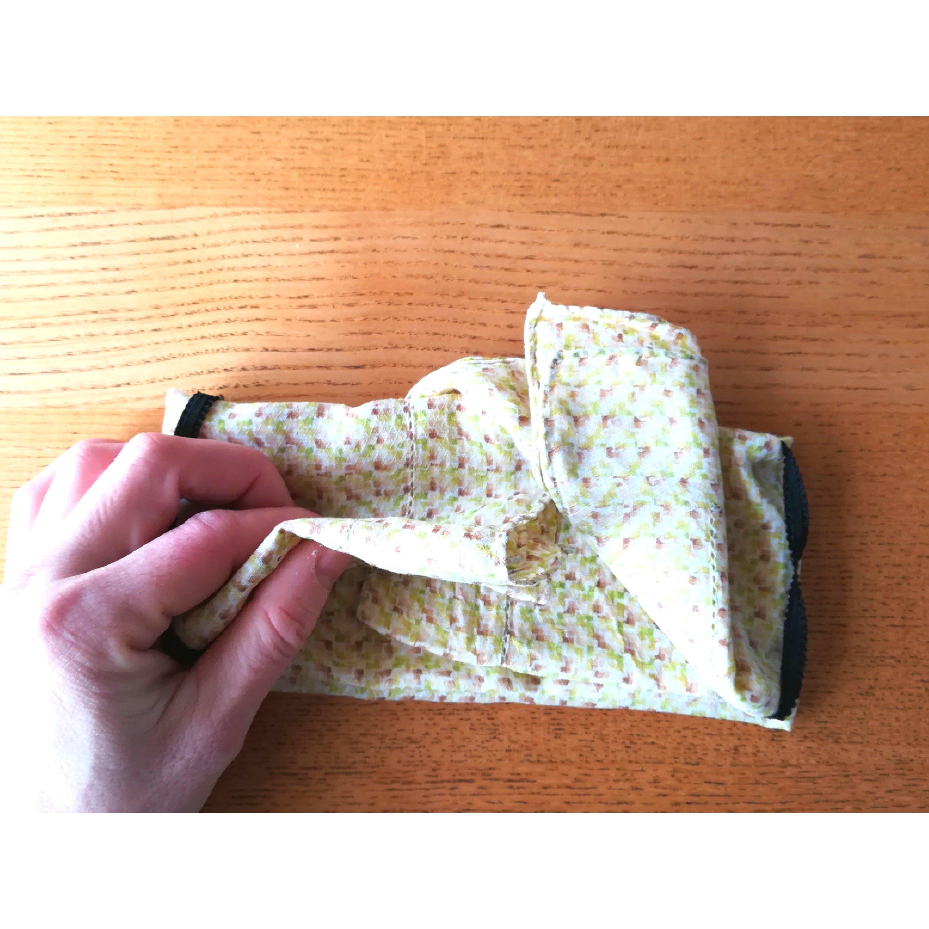 2.ゴムを両脇に通したら、ハンカチを左右から中心に向けて少し重なるようにたたみます。
