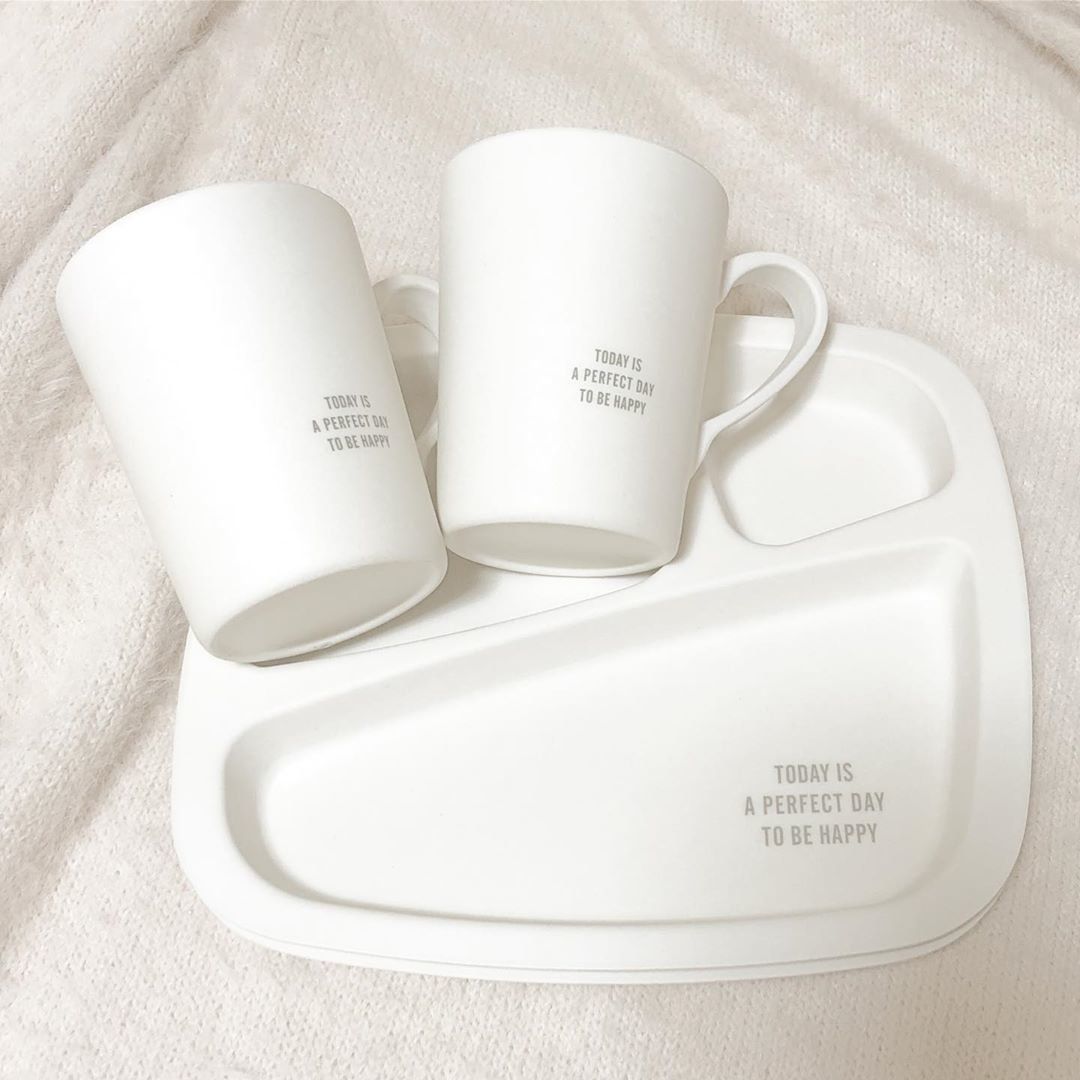 ツヤなしのホワイトにグレーの英字ロゴがかわいらしいカップとプレート。雑貨屋さんで売っていそうなおしゃれなデザインです。食卓が一気におしゃれに!