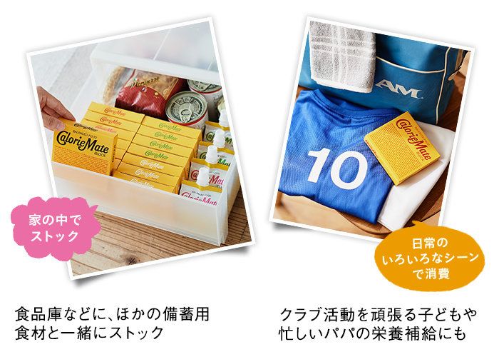 カロリーメイトは、サクッとした食感で腹持ちのよいショートブレッドタイプのブロック(左)と、食が進まないときにもすっきりと飲みやすいゼリー(右)の2タイプで、どちらも栄養バランスに優れています。家族の好みに合わせてストックしておくといいですね。