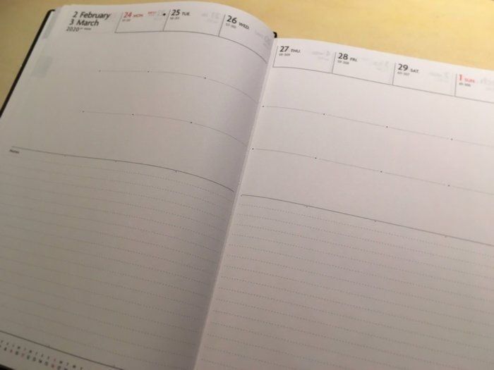 月間の予定を記入できるページはもちろん、見開きで1週間の予定を把握できる部分とノート部分がついています。