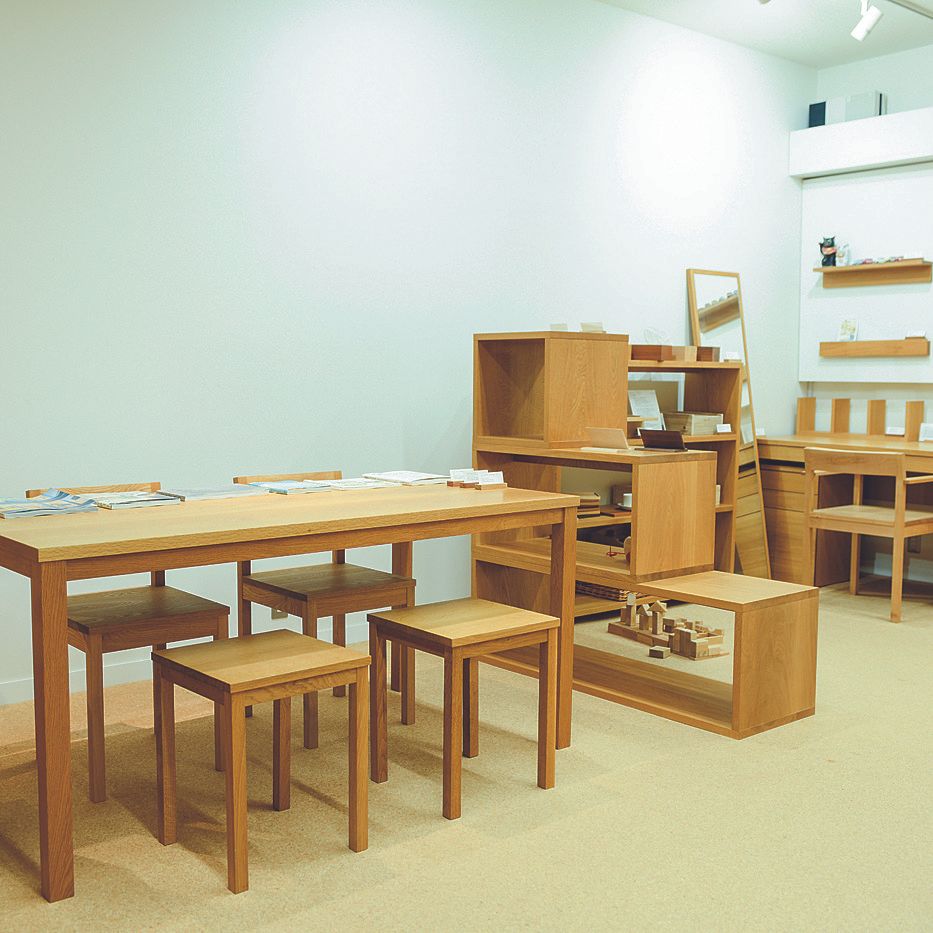 家具工房の2階にはオリジナル家具のショールームが。夫のデザインした家具が並びます。「できたての家具をさわっているとハッピーな気持ちに」