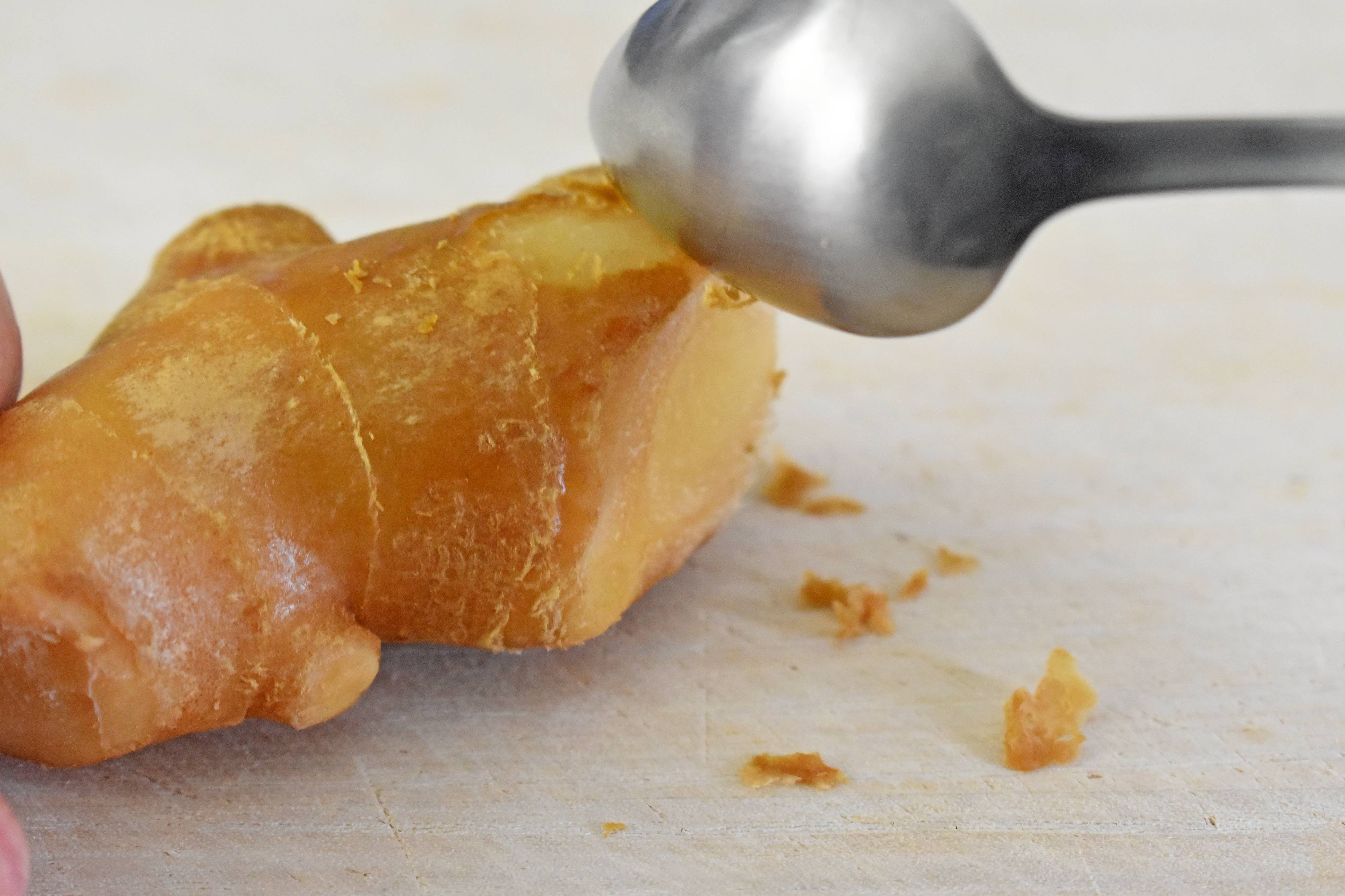 たとえばしょうがの皮むき。スプーンでこするようにすれば、無駄が少なく薄くむけます。