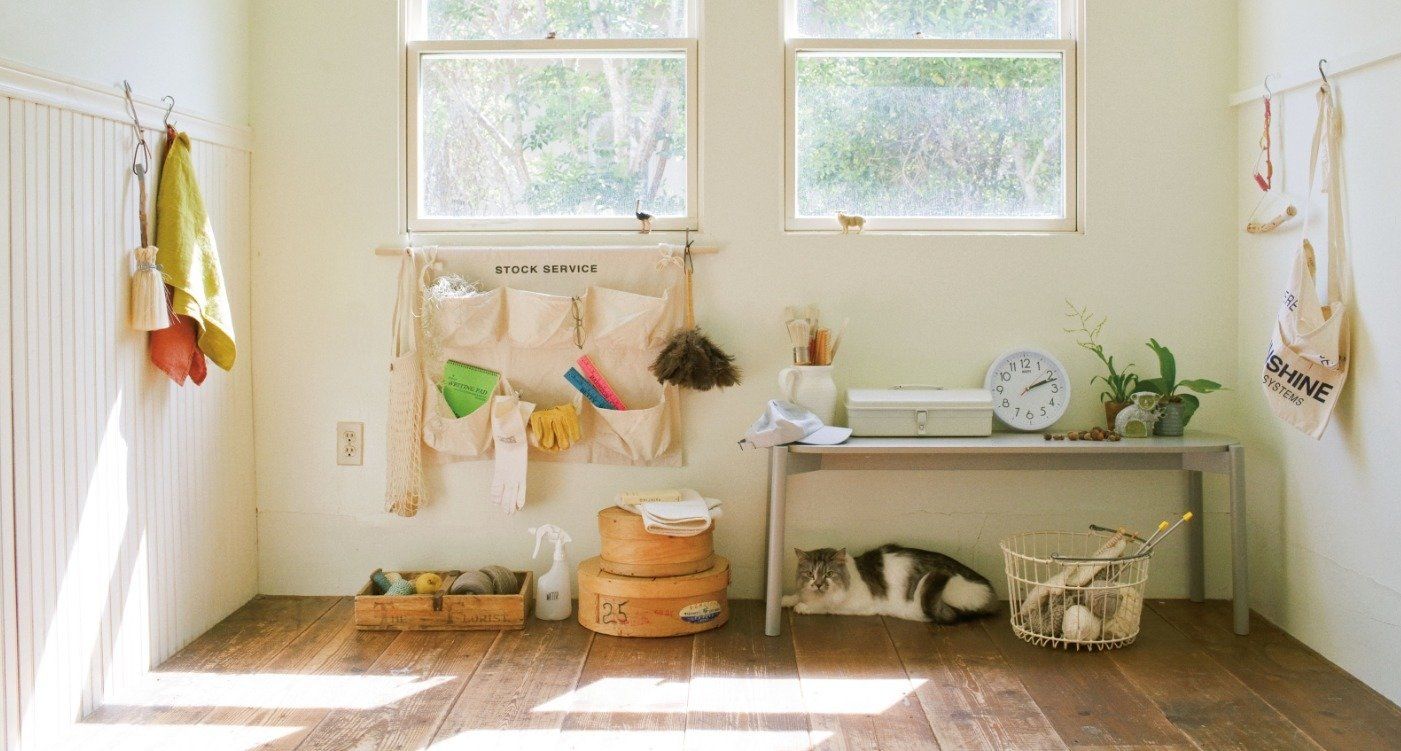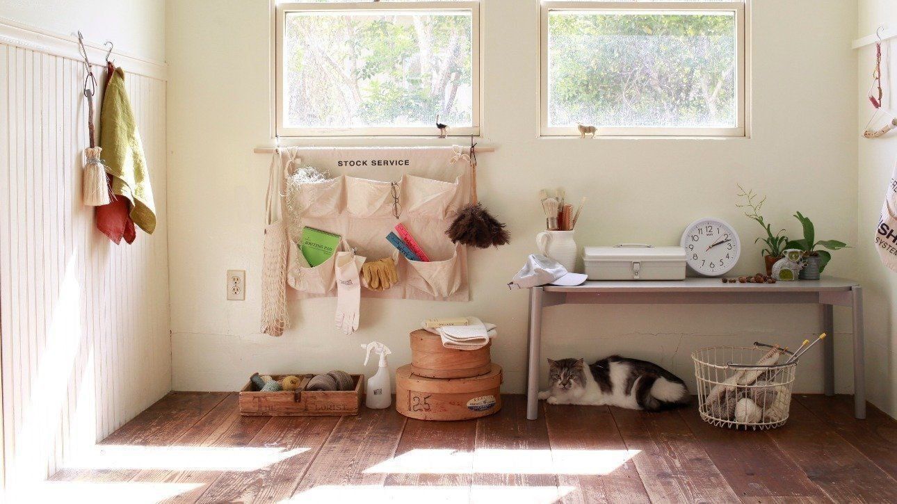 ストックサービスポケット 4800yen, 帽子 4500yen, ゴム手袋 1200yen, 右壁のエプロンバッグ 3500yen /以上ヴォイリーストア 流木のホウキ 3500yen, 流木のハンガー 5000yen /共にシボネ青山 スプレー800yen, ネットバッグ 1400yen /以上トゥデイズスペシャル自由が丘 KARIMOKU N EW STANDARD キャストールダイニングベンチ 47000yen /カリモク家具 イギリスUNITY CLOCKS の時計 2400yen, ラウンドボックス上のマルチクロス 上 800yen, 下 1000yen, 左の壁にかけたリネンクロス各 1800yen /以上ザ テイストメイカーズ & コー