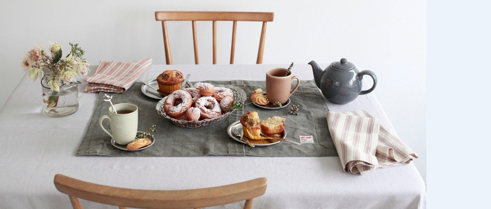 ステンレスのバスケットやソーサーで見た目の甘さは少し引き締めたスタイリング。花はクロスや食器のニュアンスと揃えた色あいのものを、小瓶に挿してカジュアルに。