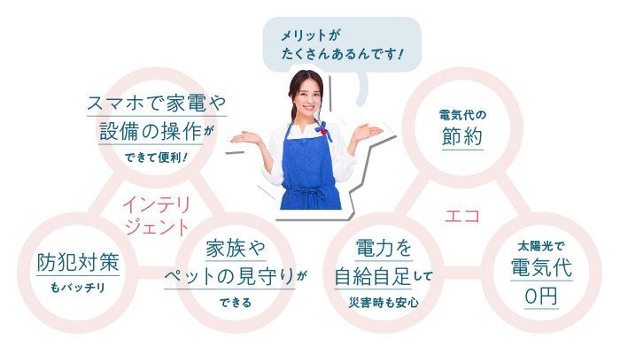 「スマートハウス」には「エコ」と「インテリジェント」の2つの大きな特徴があり、それは私たちにとってメリットがいっぱい! まず「エコ」としては、住まいの構造や断熱性能を見直し、エネルギー効率を上げ、太陽光発電でエネルギーを自給したり、省エネ型の家電製品などを使うことで電気代を格段に減らすことができるんです。