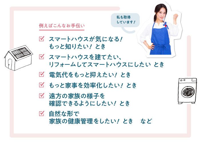 自分の家をスマートハウス化したい!と思っても、どうしたらいいの?というとき、心強い味方になってくれるのが〝スマートマスター〝。住宅、家電、エネルギーの知識を持つ〝スマートマスター〝は一般財団法人 家電製品協会から認定された資格者で全国に約7000人(2019年11月現在)。「スマートハウス」について、さまざまな相談に乗ってくれます。