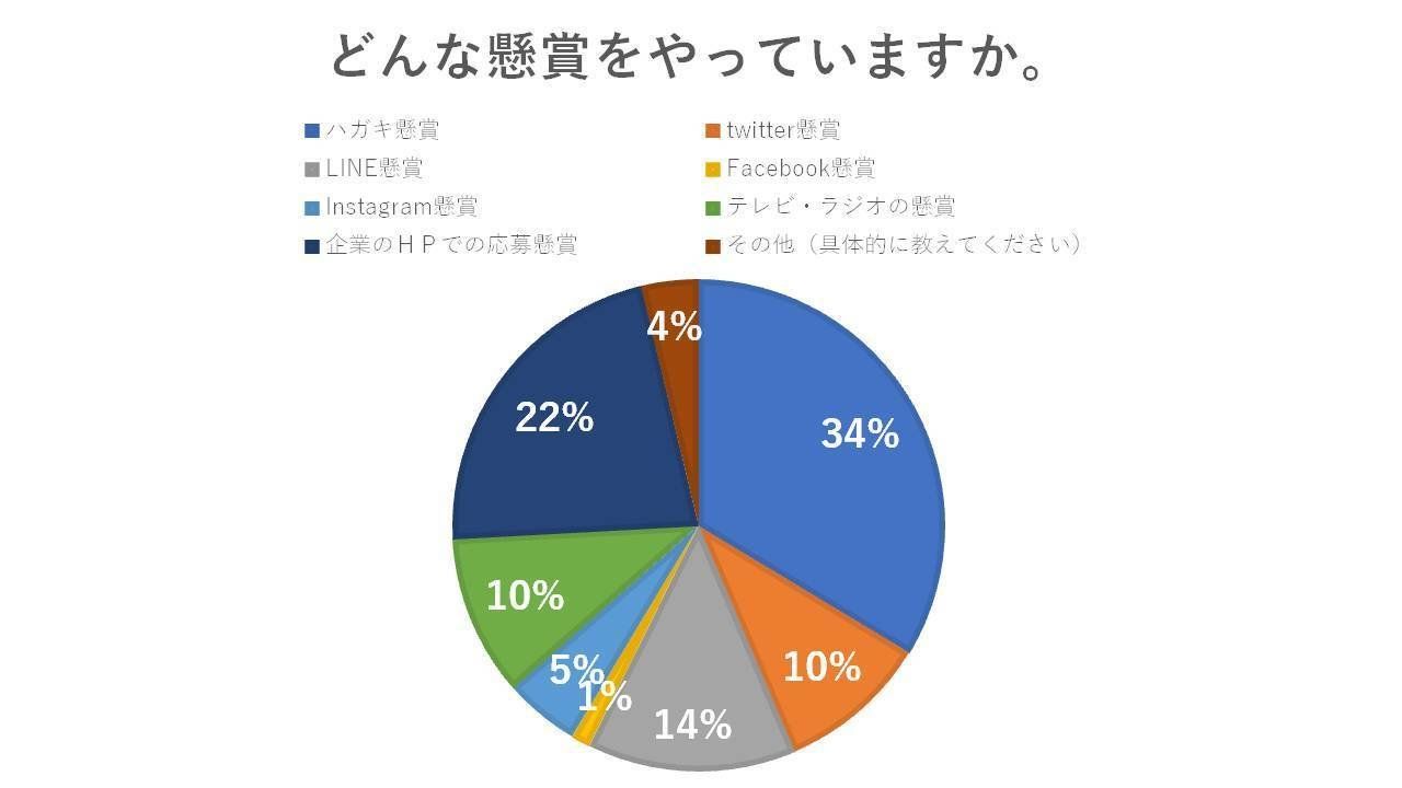 ハガキやSNSなど、どんな種類の懸賞をやっているのか聞いてみたところ、いちばん多かったのは「ハガキ懸賞」の34%、続いて「企業のホームページ懸賞」の22%。