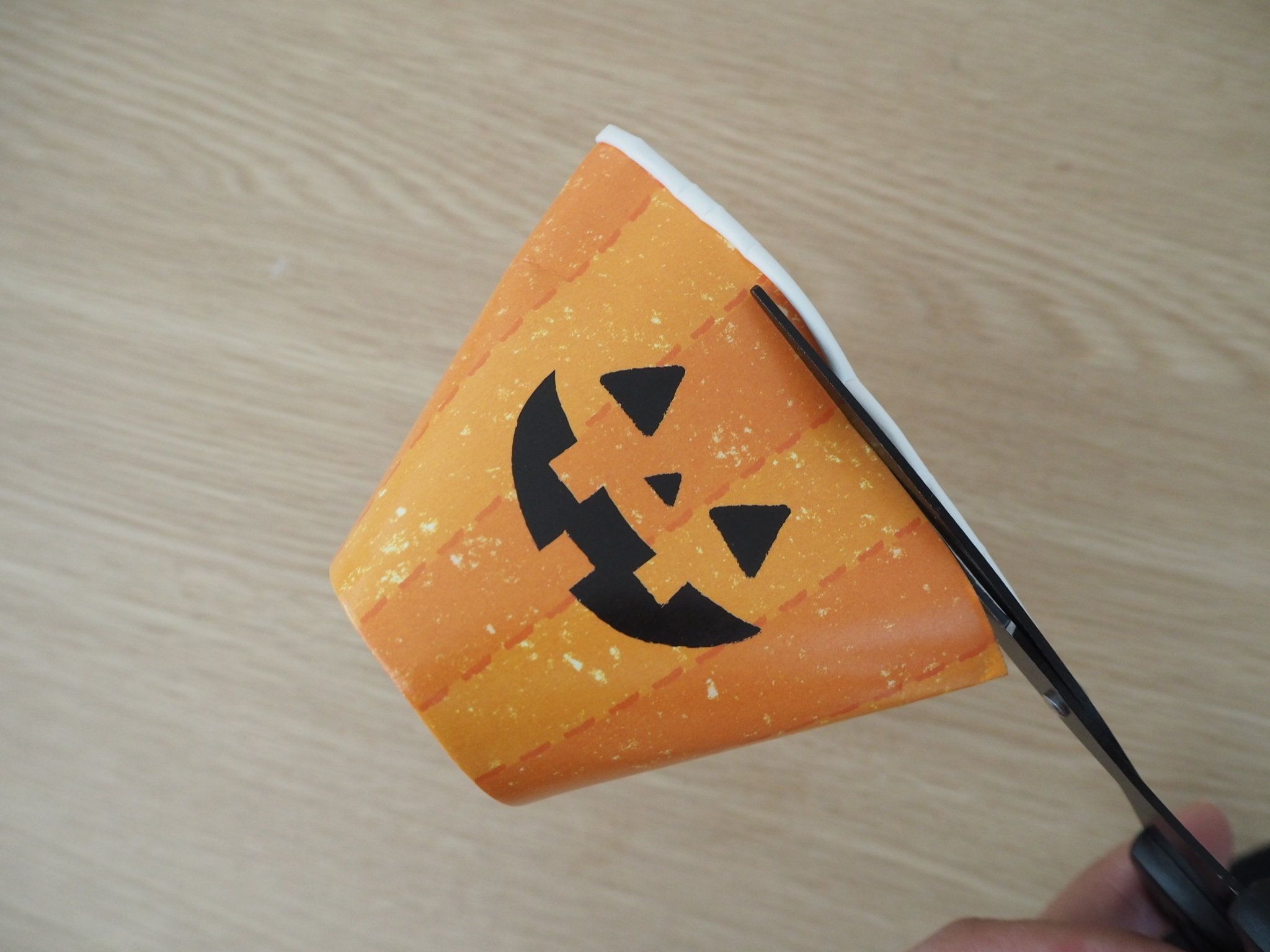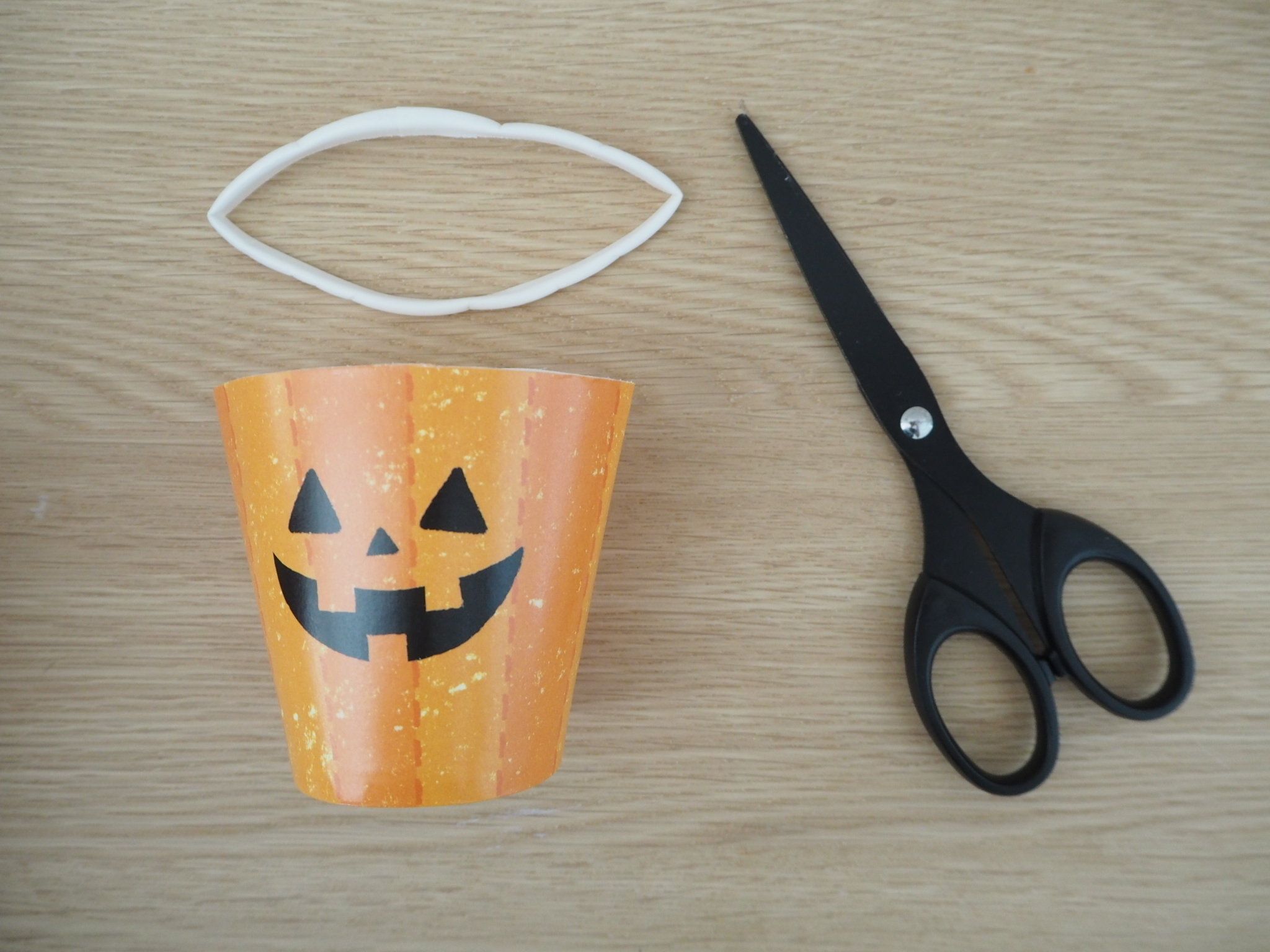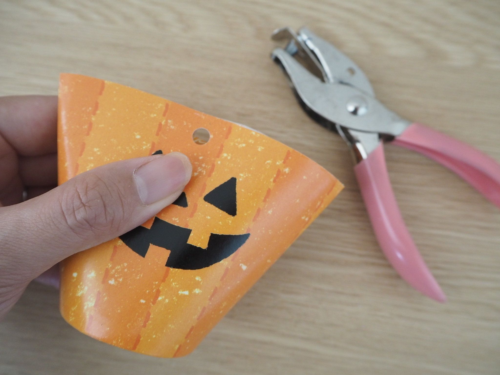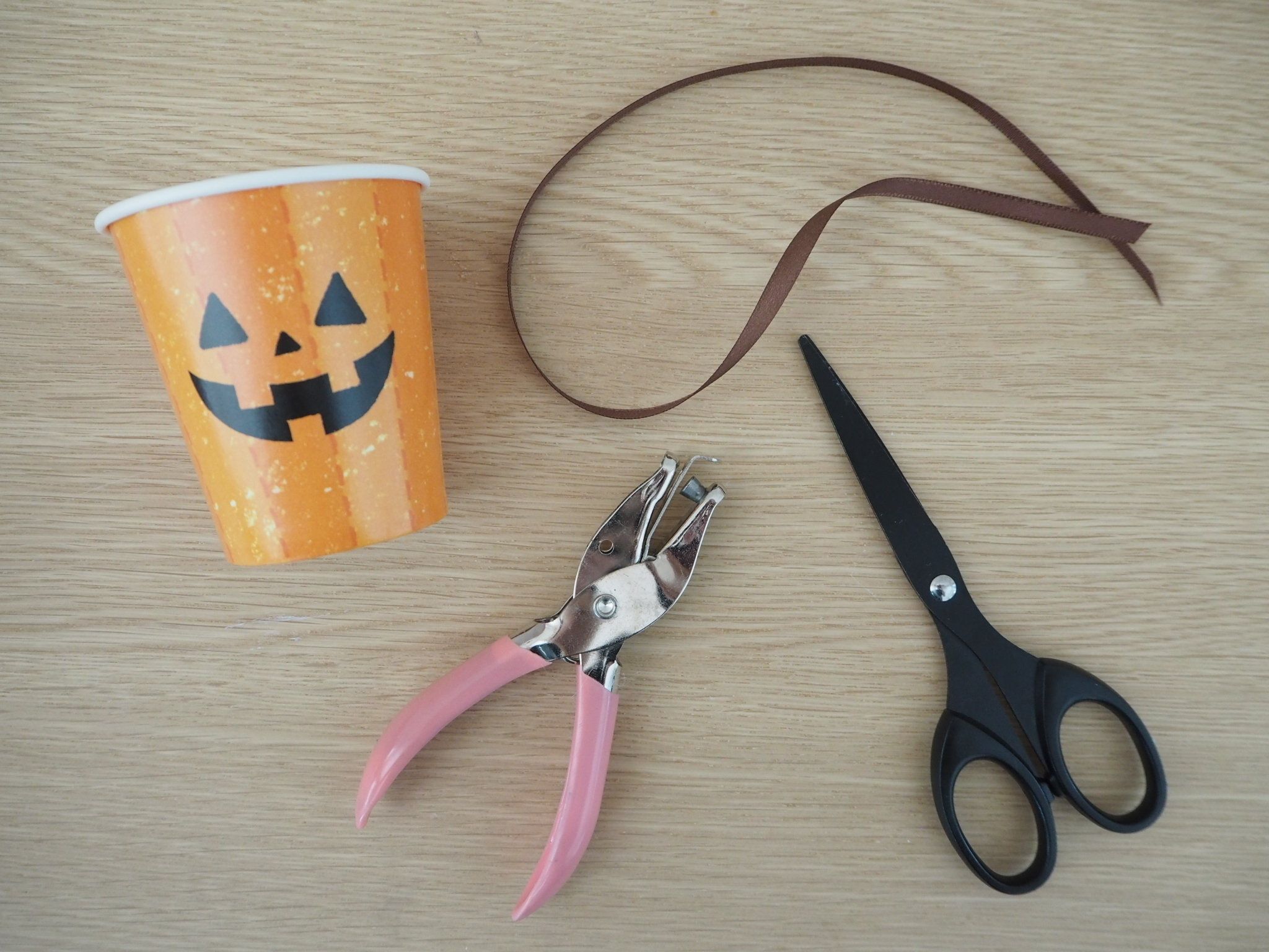 今回はハロウィンシーズンなのでジャックオーランタンの紙コップを使用。使用する紙コップによってイベント感を出せるのがGOOD!紙コップの他にリボン、ハサミ、穴あけパンチも準備しましょう。