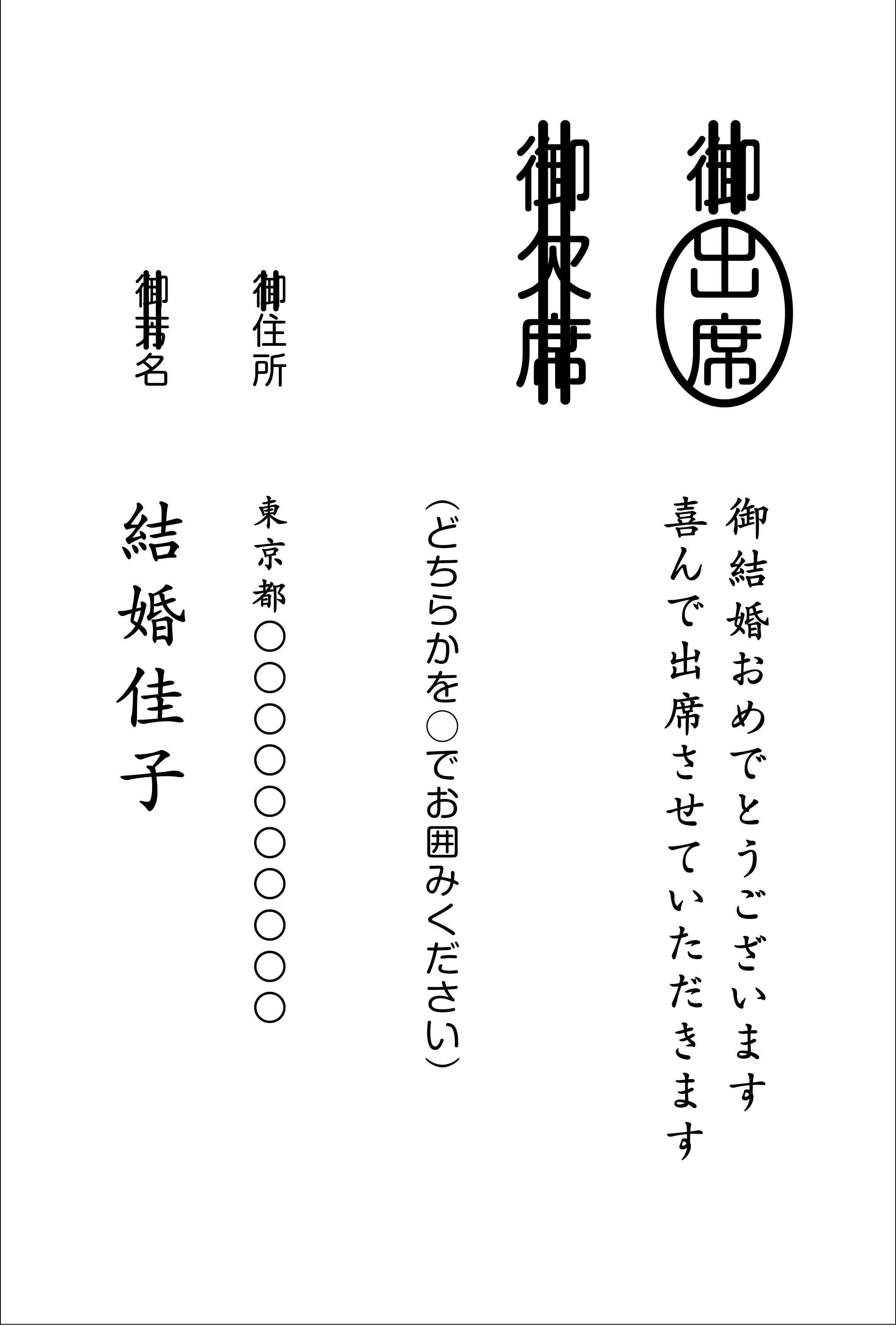 印刷されている御出席の「御」と「御欠席」を二重線か斜線で消し、「出席」を丸で囲みます。その下に「このたびはご結婚おめでとうございます 喜んで出席させていただきます」などと書き入れます。御住所の「御」と御芳名の「御芳」も二重線か斜線で消します。