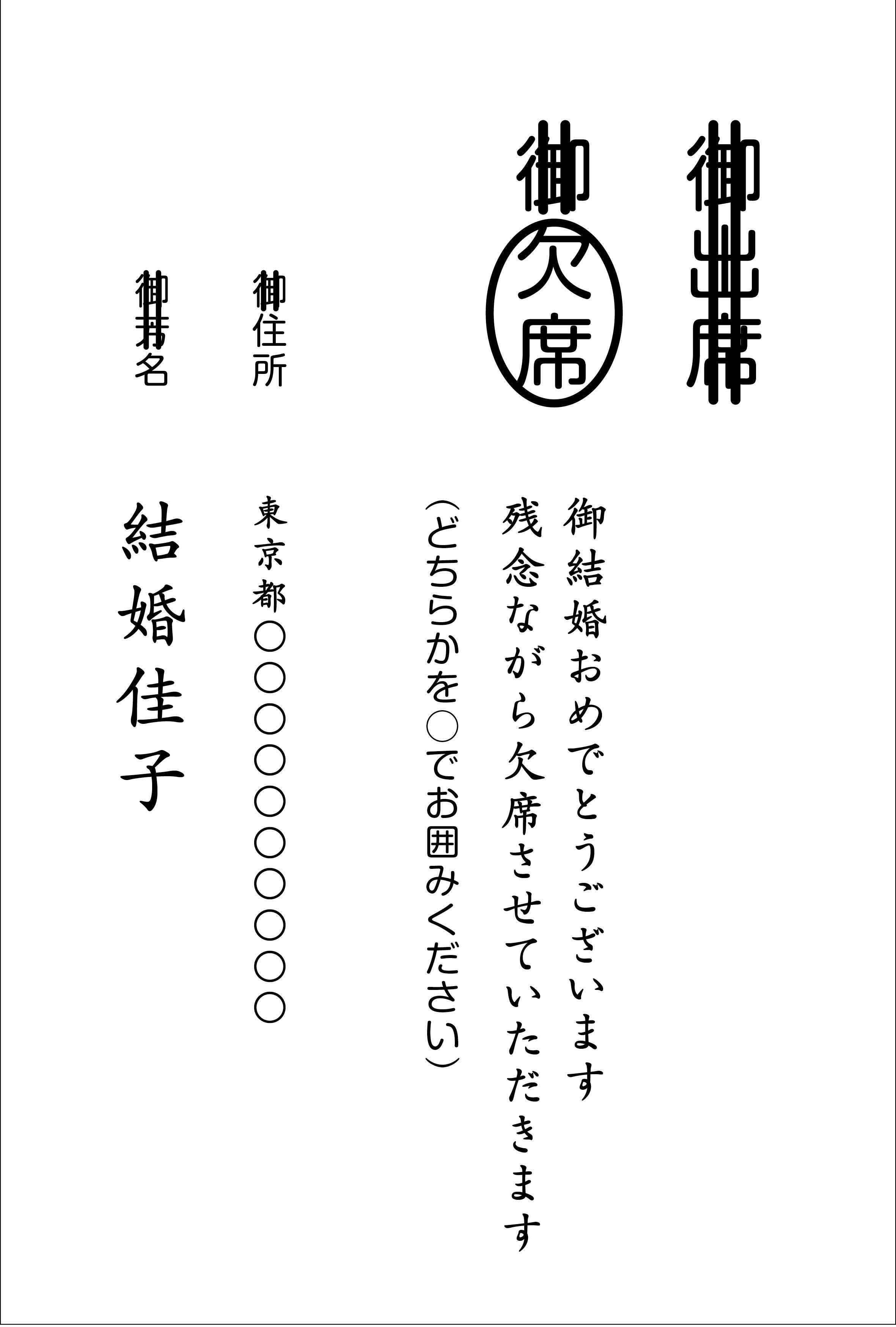 「御出席」と御欠席の「御」を二重線か斜線で消し、「欠席」を丸で囲みます。その下に「このたびはご結婚おめでとうございます 当日はあいにくやむを得ない用事がございますので」などと書き入れます。事故や、仏事、葬儀など身内の不幸と重なった場合には、理由をはっきり書かないようにします。御住所の「御」と御芳名の「御芳」を二重線か斜線で消します。