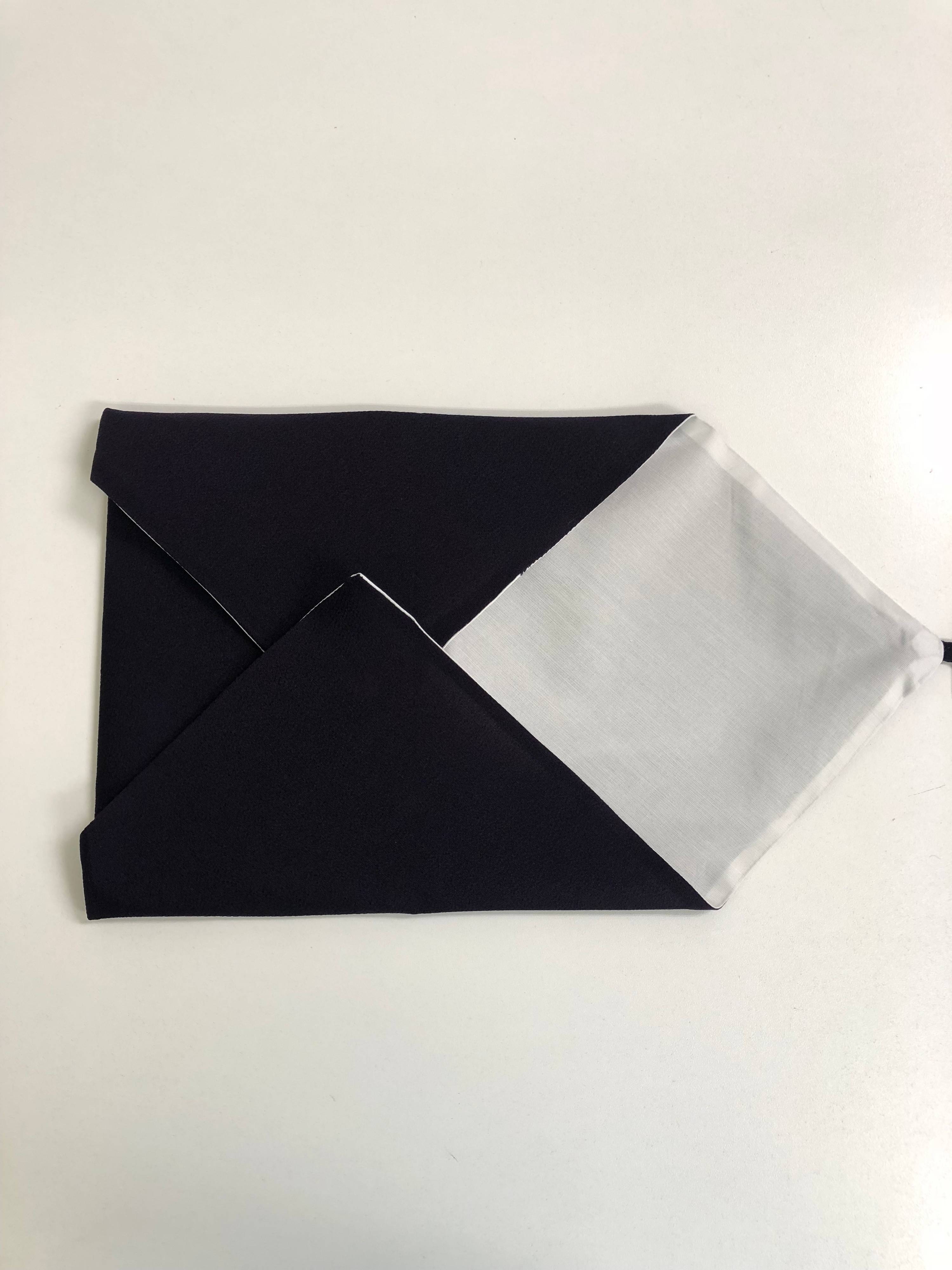 5.右を折り、裏へ折り返す。左の上下に小さく三角形ができる。