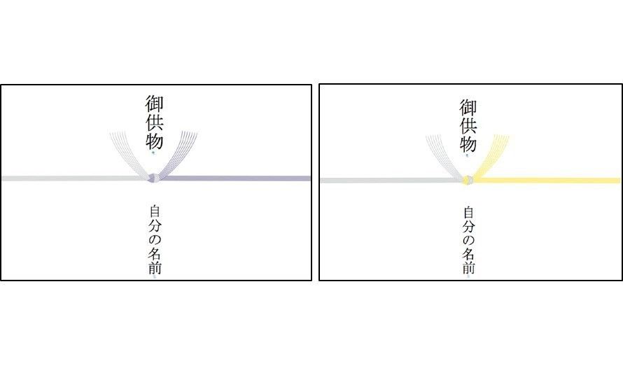 お菓子や果物などをお供えするときは、そのままだと失礼になるので、掛け紙や「のし」をつけて持って行きましょう。表書きは「御供」か「御供物」。掛け紙の「水引き」には一度きりという意味合いの「結び切り」を使います。こちらも地方によって色が違うので、確認しましょう。品物でお供えをするときは、誰が持ってきたかわかるように「内のし」より「外のし」にします。