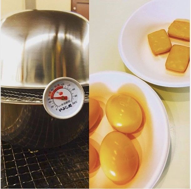 shohei_k_14さんは、100均のボウルを二つ合わせて燻製器を作ったんだそう。たまごとベビーチーズがキレイな燻製色にできあがっています!