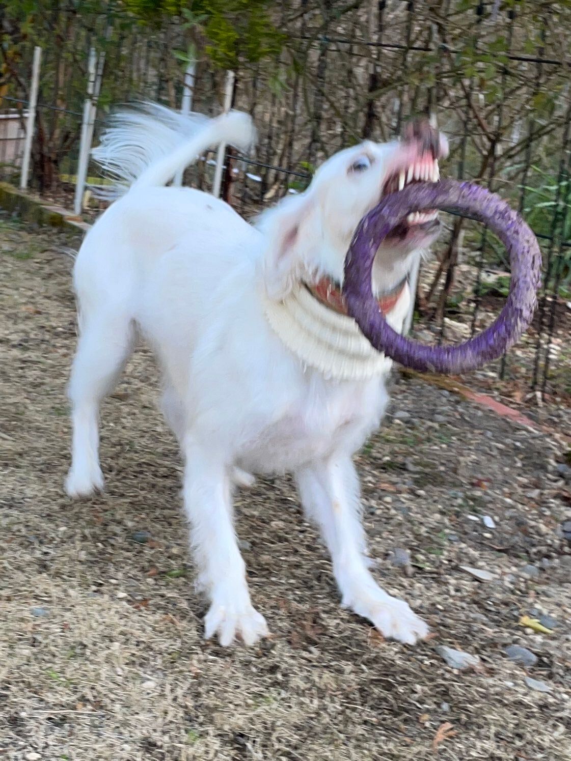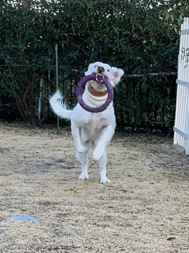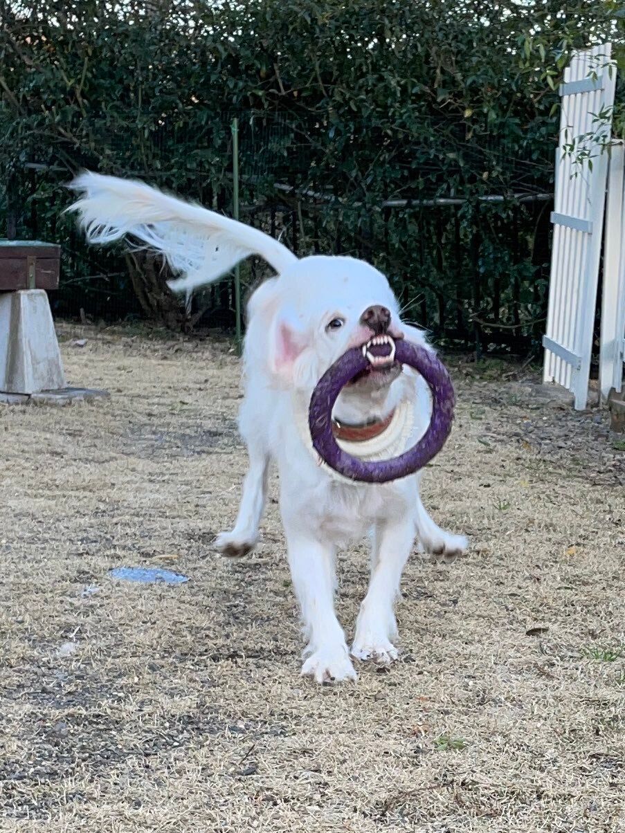 歯をむき出しにして、投げられたおもちゃをしっかりとキャッチする姿は迫力満点!麦ちゃんの俊敏さがうかがえます。7,800件を超えるいいねが集まり、コメント欄では、元気あふれる様子を「犬じゃなくて白い魔獣だったのよ」「一瞬上顎が抜けたのかと……」と表現する人もいました。