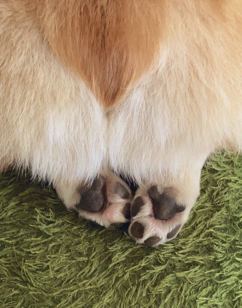 「お父さんは、くまさんのあんよが特にお気に入りです。くまさんのあんよは、3匹のコーギーの中で一番太くて、肉球は分厚くてムチムチしています。触り心地抜群で、お父さんはいつも『なんだこの足は!なんでこんなに太いんだ!』と言ってなでなでしています」