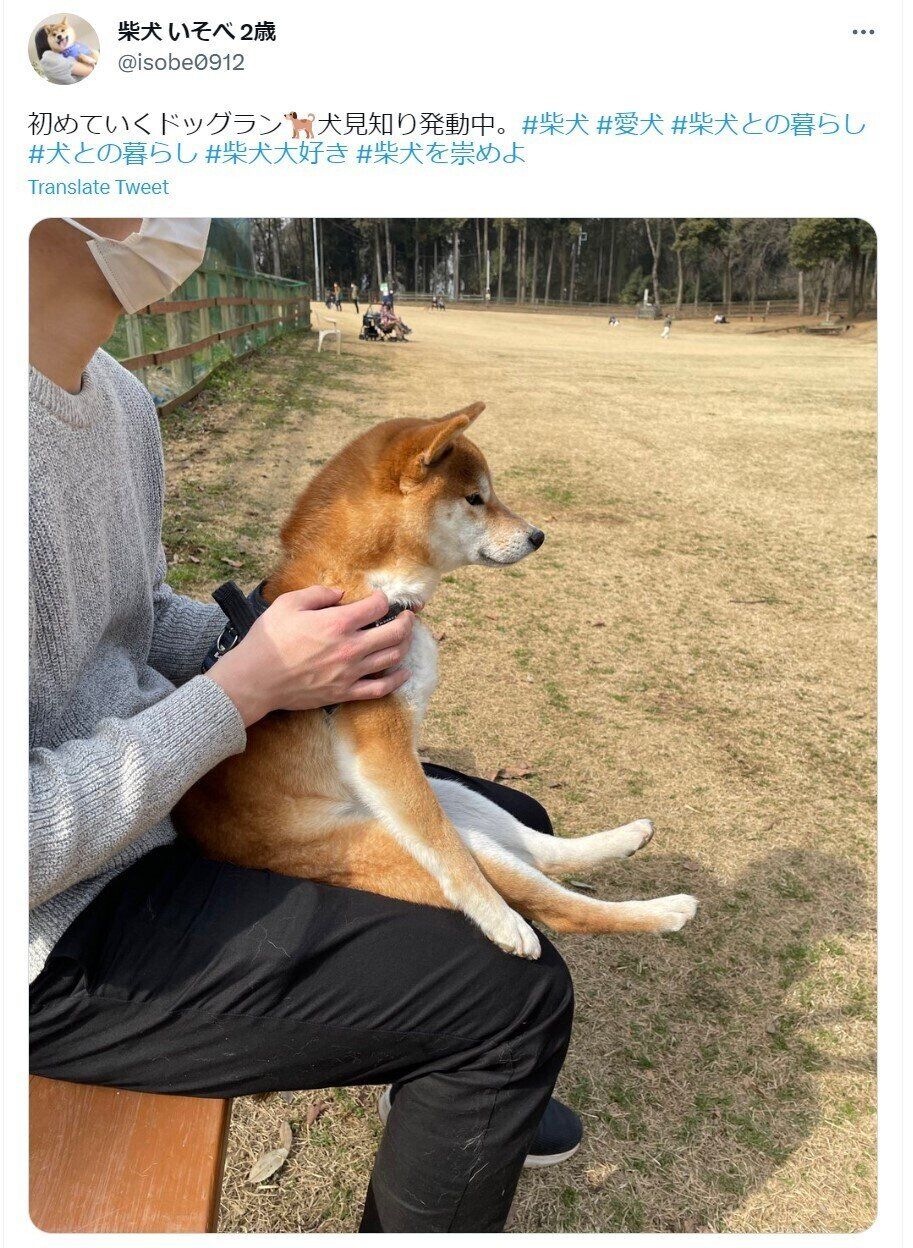 「初めていくドッグラン 犬見知り発動中。」というタイトルで投稿したTwitterに4.5万超えの「いいね」が集まった、柴犬 いそべ 2歳さん(@isobe0912)。飼い主さんの膝の上でカチコチに座るいそべくんについてお話を聞きました。