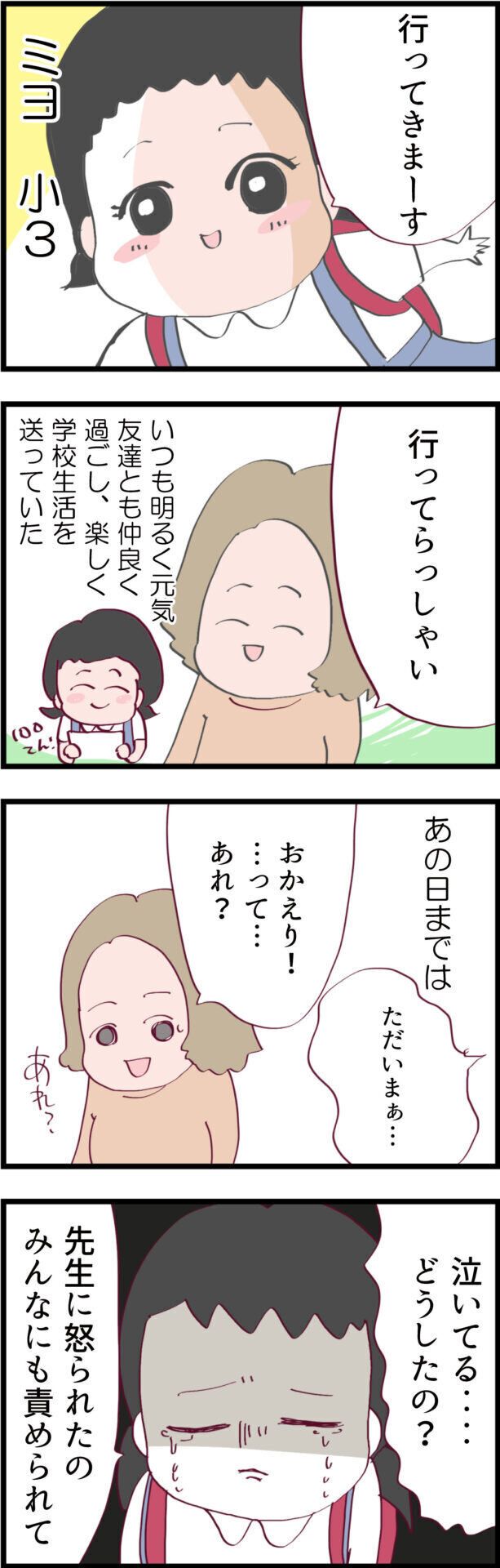 学校から泣きながら帰ってきたミヨちゃん。一体何があったのでしょうか。