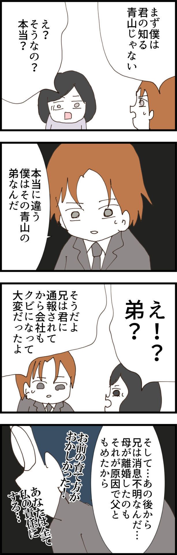 なんとマユさんの夫は、青山さんの弟だったのです!青山さんはあの事件のあと、会社もクビになり消息不明になってしまったそう。しかし、マユさんとの出会いは本当に偶然だったようで、正体がバレると嫌われると思い隠していたとか。子どもも生まれたばかりだし、このまま結婚生活を今までどおり続けたいと夫は言いますが…。