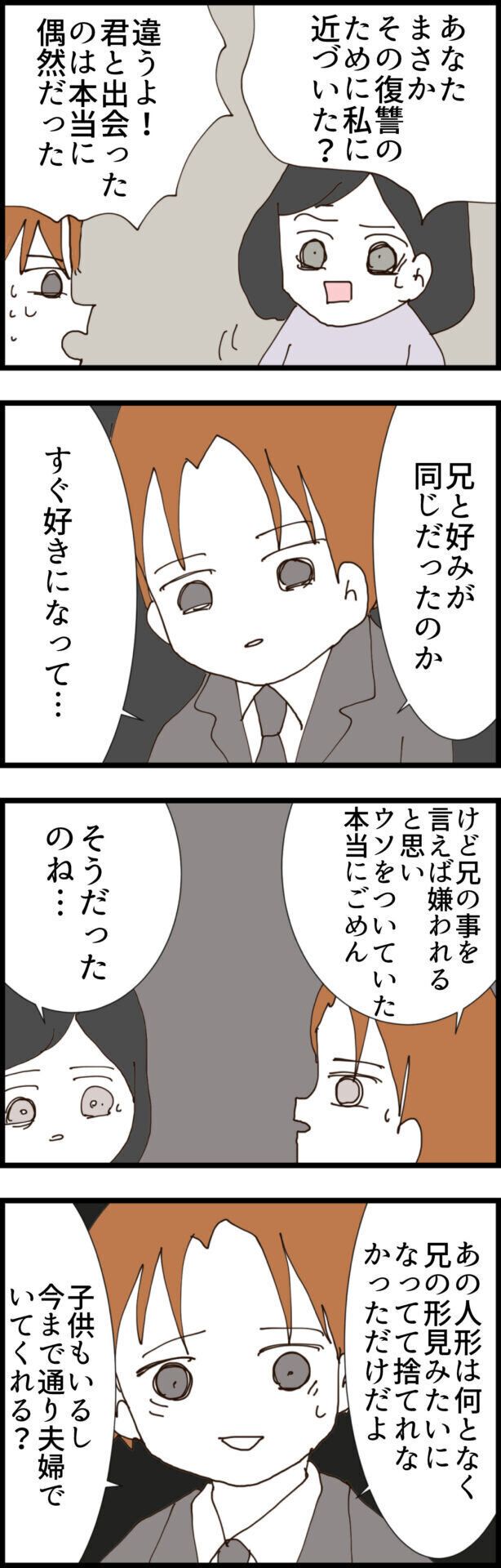 そこでこっそり夫の荷物を探ってみると、なんとあの血まみれの人形が出てきたのです!マユさんは義母に、息子はストーカーの青山さんなのかとストレートに聞いてみますが、またもやはぐらかされ、息子に直接聞いてと言われてしまいます。その夜、今度はマユさんは帰宅した夫に直接聞いてみると、いったんはごまかされてしまいます。しかし、人形のことを話すと夫も観念したようで、全部説明すると言ってくれましたが…。