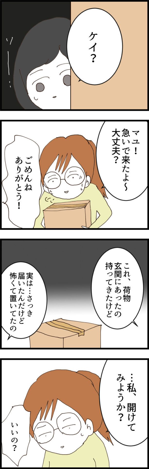 怪しい宅配業者が置いていった、身に覚えのない荷物。親友のケイさんが運んできてくれて、思い切って開けてくれましたが、その中身をみて2人は驚愕します!