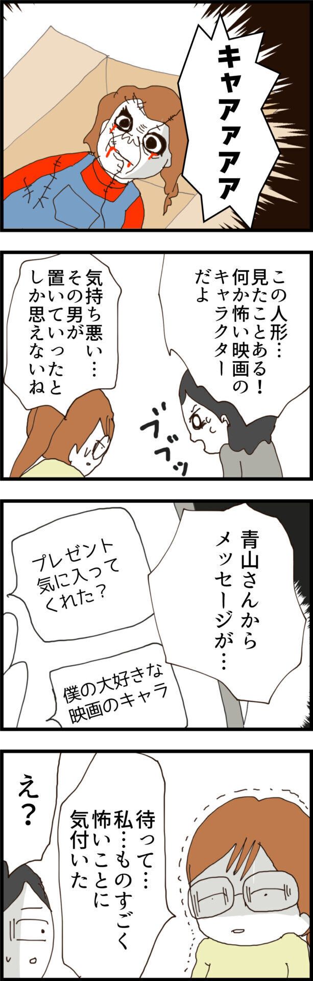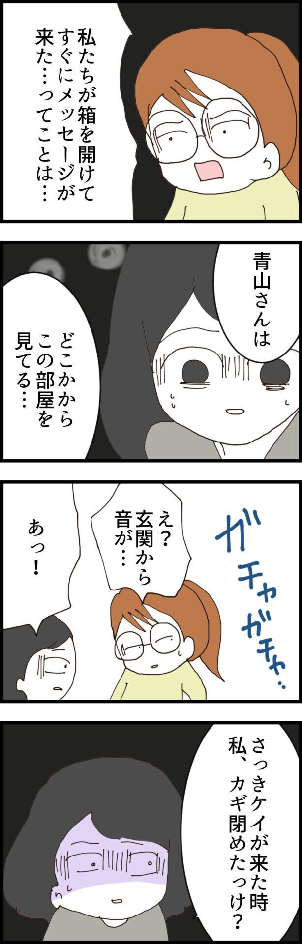 なんと中に入っていたのは、血だらけの映画キャラクターの人形でした。しかも、開けた直後に青山さんからメッセージが届き、どこからか見張られていることも発覚!さらには、鍵をかけ忘れた玄関ドアからも開く音がして…。恐怖のできごとはまだまだ続きそうです。