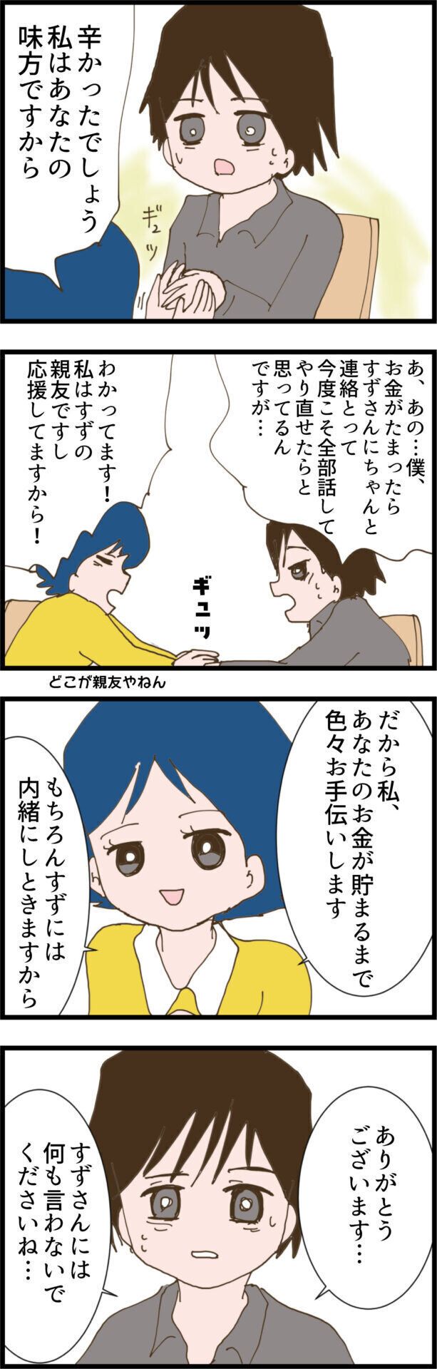 とても大切なことを、彼も親友2人もすずさんに秘密にしていたのにも関わらず、悪気はなかったと言っていますが、これでは人間不信になってしまうのも頷けます。親しい人ほど、裏切られたときのショックは大きいもの。また信じられるようになるには、かなりハードルがあがってしまいそうです。