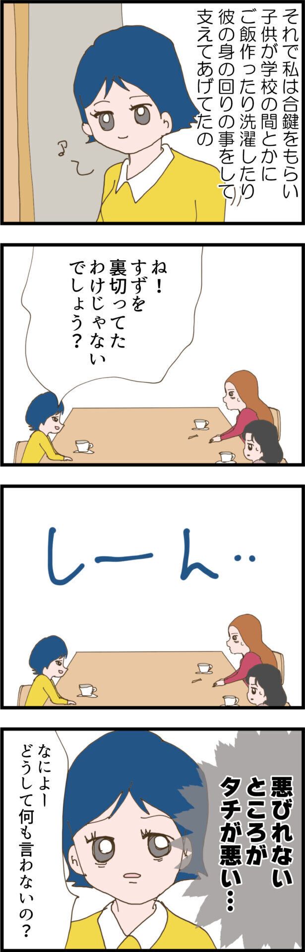 彼が結婚式に現れなかった理由は、当日の朝、彼の妻が階段から落ち、意識が戻らずまだ入院しているからでした。しかし、それをきいたアオイさんは、なぜかすずさんに内緒で、彼の家の合いカギをもらい、彼の身のまわりの世話をかってでていたようですね。親友といいつつ、彼にこっそり近づいていたアオイさん。