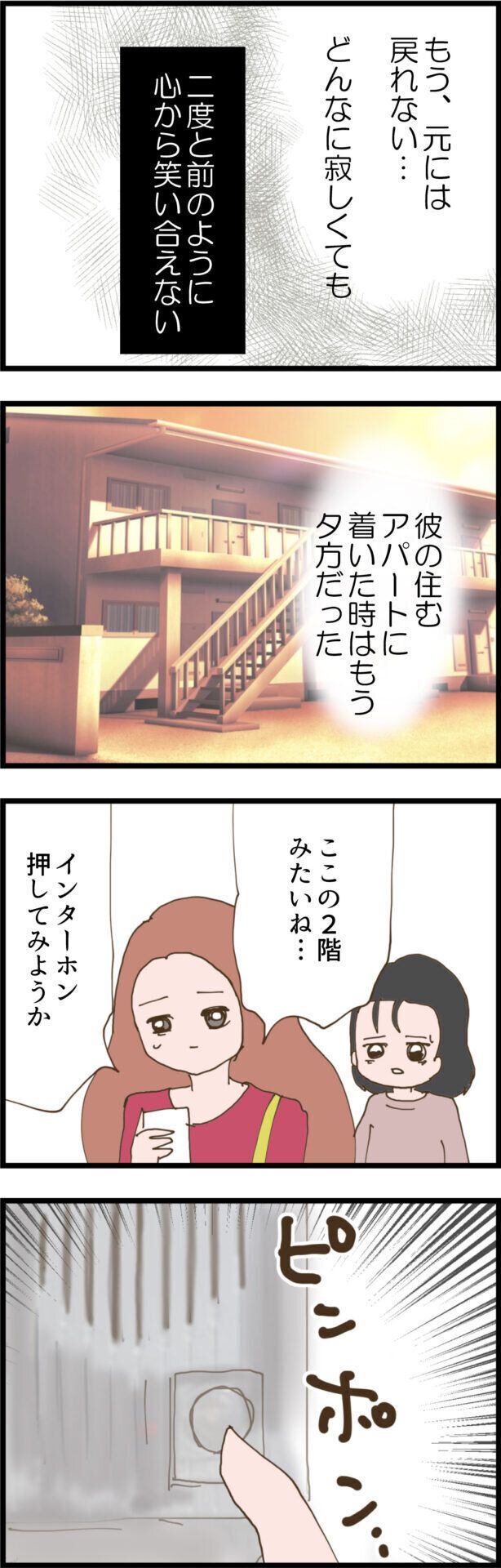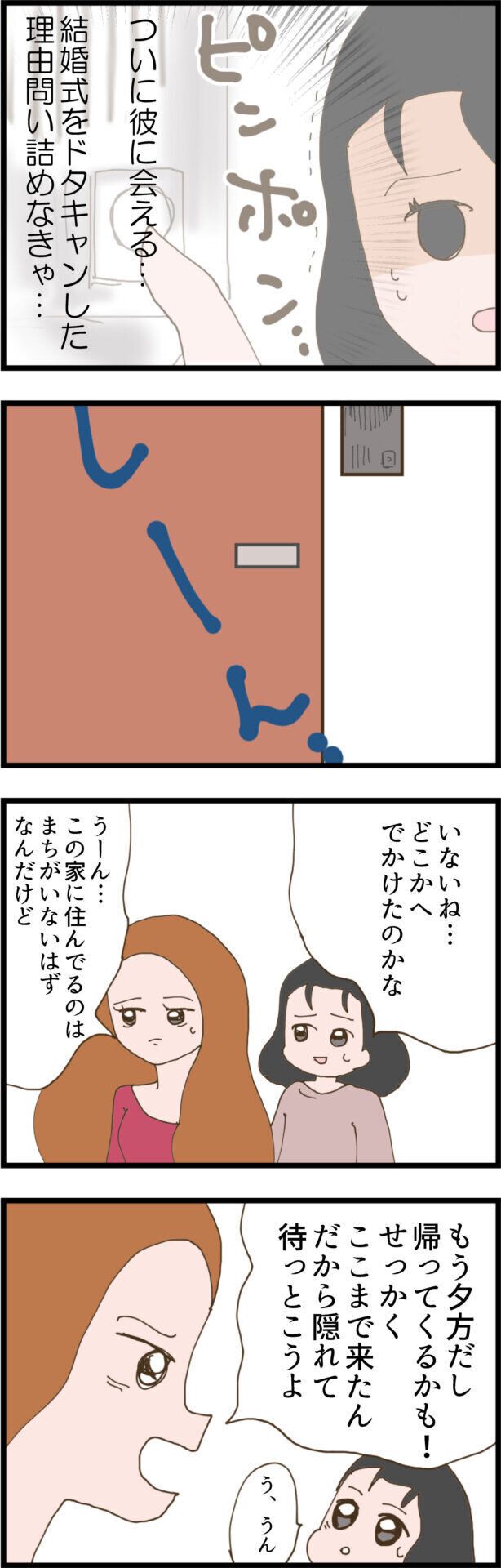 探偵事務所に聞いた彼が今住んでいるはずの住所へとさっそく2人で向かいますが、すずさんの胸中は複雑。もはやミキさんとどんな会話をしたらいいのかすらわからなくなっていました。そして夕方、2人は彼の家にようやく到着し、ミキさんがインターホンを押してみると…。
