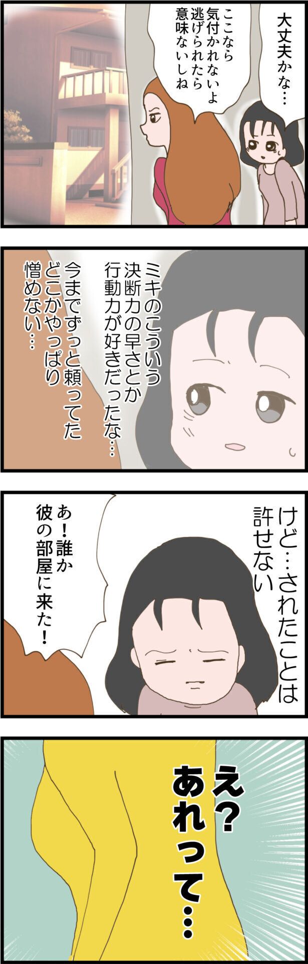 留守のようでしたが、せっかくなので彼の帰宅を隠れて待つことに。待つ間、やっぱりミキさんの決断力の速さや行動力が好きだったと思い返し憎めないとも感じたすずさん。しかし、許せない気持ちは変わりませんでした。そんな中、彼の家に誰かが来たようですが、それは…。