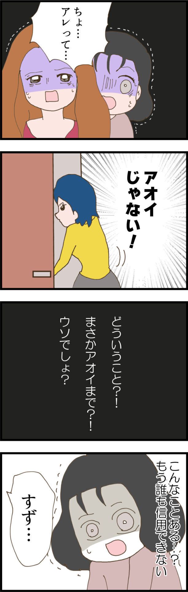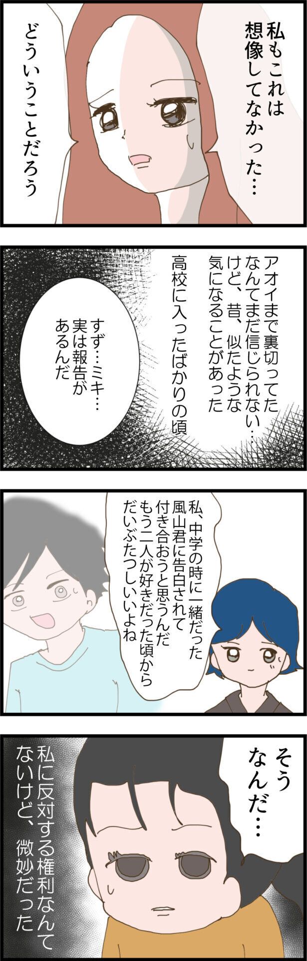 すずさんの彼の家に帰ってきたのは、あろうことか2人の親友であるアオイさんでした。驚きと戸惑いを隠せない2人。もう誰も信用できないすずさん。しかし、思い返すと高校時代に同じようなことがあったのです!アオイさんは、中学時代にすずさんとミキさんが好きだった人に、告白されたからと、つきあったことがあるのでした。人は大人になっても、なかなか根本的な性格は変わらないのかもしれません。いったいなぜ、アオイさんがすずさんの彼の家に入っていったのか、まだまだ謎は深まるばかりです。