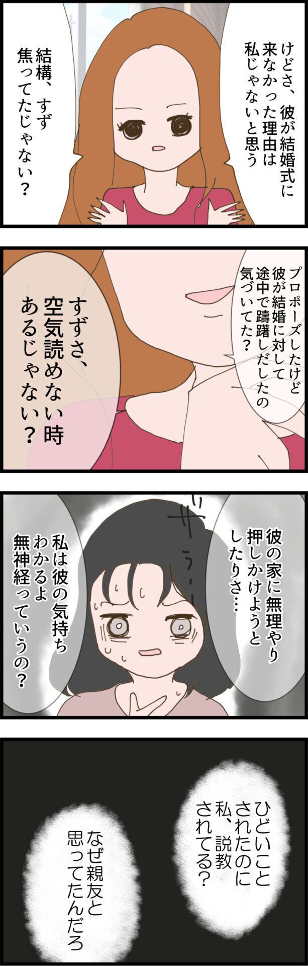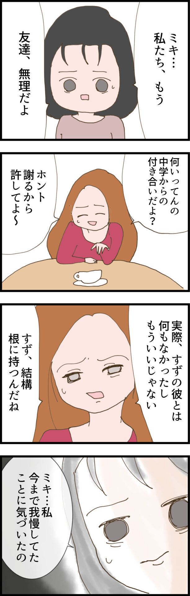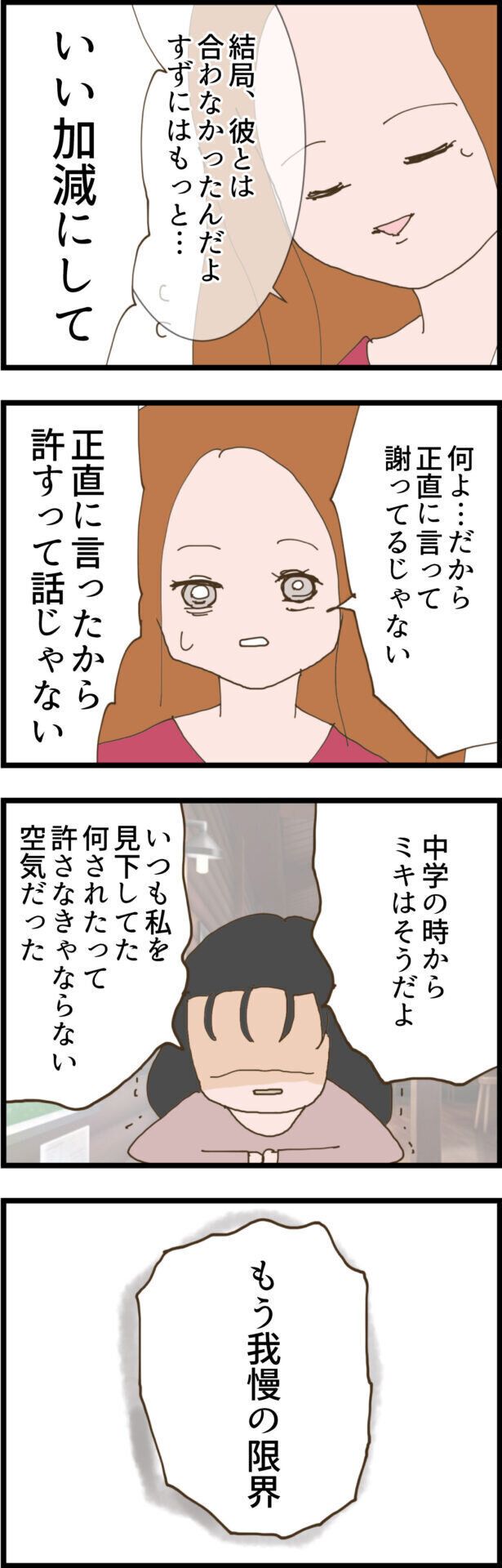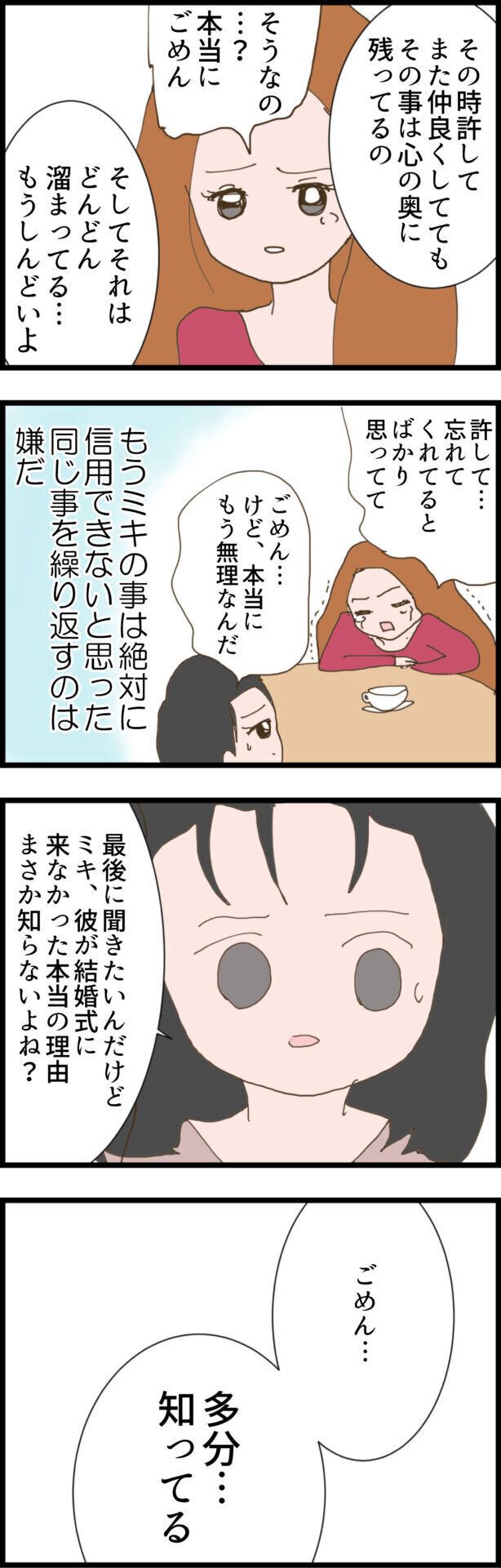 これ以上、友達関係ではいられないと決別宣言をしたすずさんは、いつも我慢していたことをミキさんに告げます。そして、もうミキさんを絶対に信用できないことも自覚しました。そこで最後に、すずさんの彼が結婚式に来なかった理由を本当に知らないかミキさんに聞いてみましたが、どうやら思い当たることがある様子。