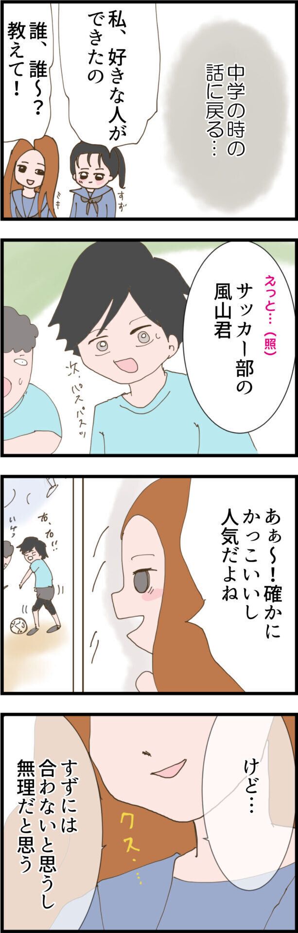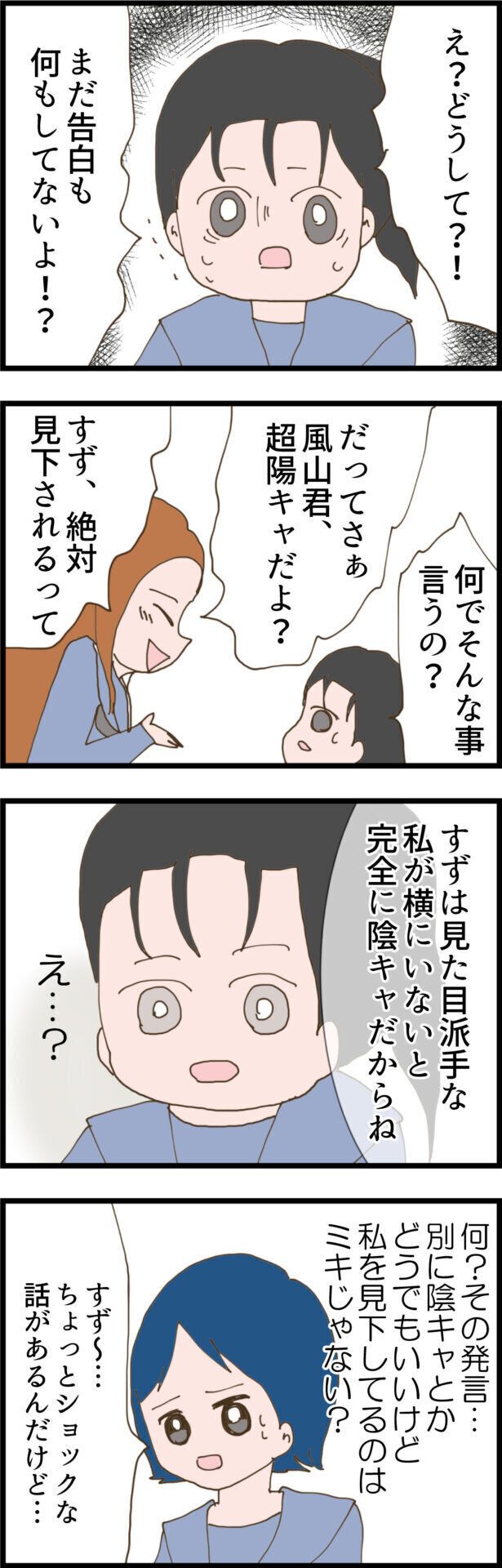 思い返すと中学生時代からミキさんに見下されていたすずさん。好きな人の話をしたときも、サッカー部の人気者でかっこよかった風山くんは超陽キャだから、陰キャなすずさんには合わないと言われてしまいます。さらにアオイさんから教えてもらった驚きの出来事が…。