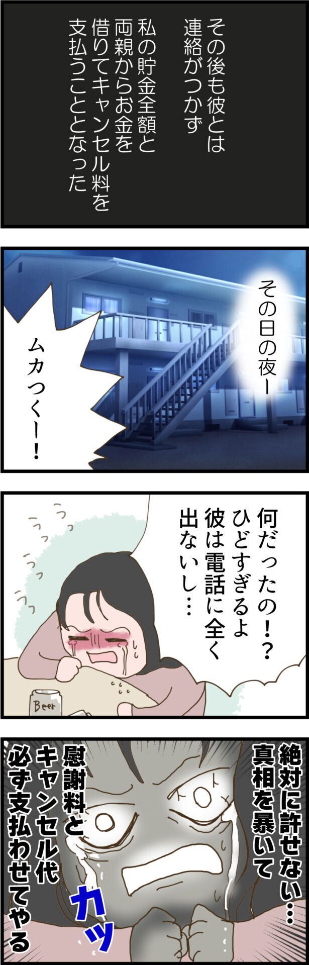 結婚式に彼が来ないだけでなく、次々と周囲のウソが発覚し絶望するすずさんでしたが、さらに結婚式のキャンセル料に打ちのめされます。結局、彼とはそれ以降連絡がとれず。すずさん側だけで高額なキャンセル料を支払うことに…。その晩、すずさんは怒りが収まらず、真相を暴き、絶対慰謝料とキャンセル料を支払わせてやる!と、意気込むのでした。