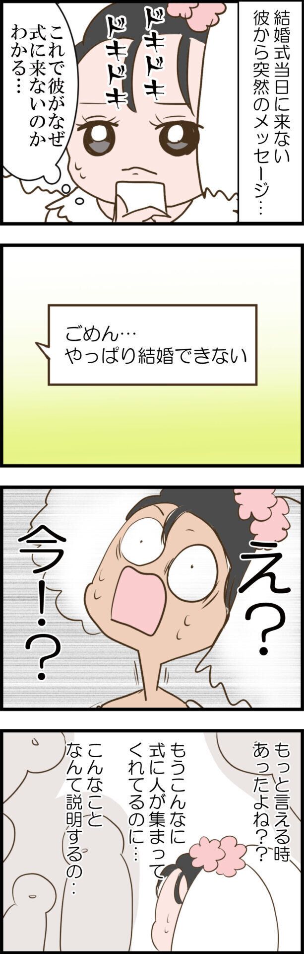 【漫画】第2話「彼が結婚式当日に来なかった衝撃の理由」彼から届いたメッセージに唖然とする花嫁
