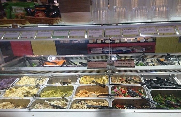 店内奥にあるデリコーナー。サラダからローストチキン、キヌアなどのスーパーグレインまで、種類いろいろ。お皿に好きなものを好きなだけ取ってレジにある計量器にのせ、グラム数に応じて支払いをする仕組み。お客さんから寄付されたお皿やカトラリーを借りて店内で食べる場合は割引も。当たり前のようにエコなところも気持ちいい。