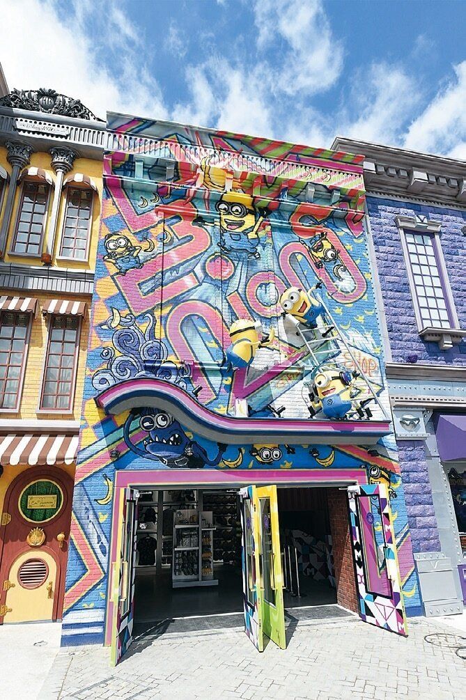大量のミニオンたちが街のあちこちでやりたい放題に大暴走するエリア。どこもかしこも撮影スポットになるカラフルな空間には、実際に映画に登場したミニオン行きつけのショップも。