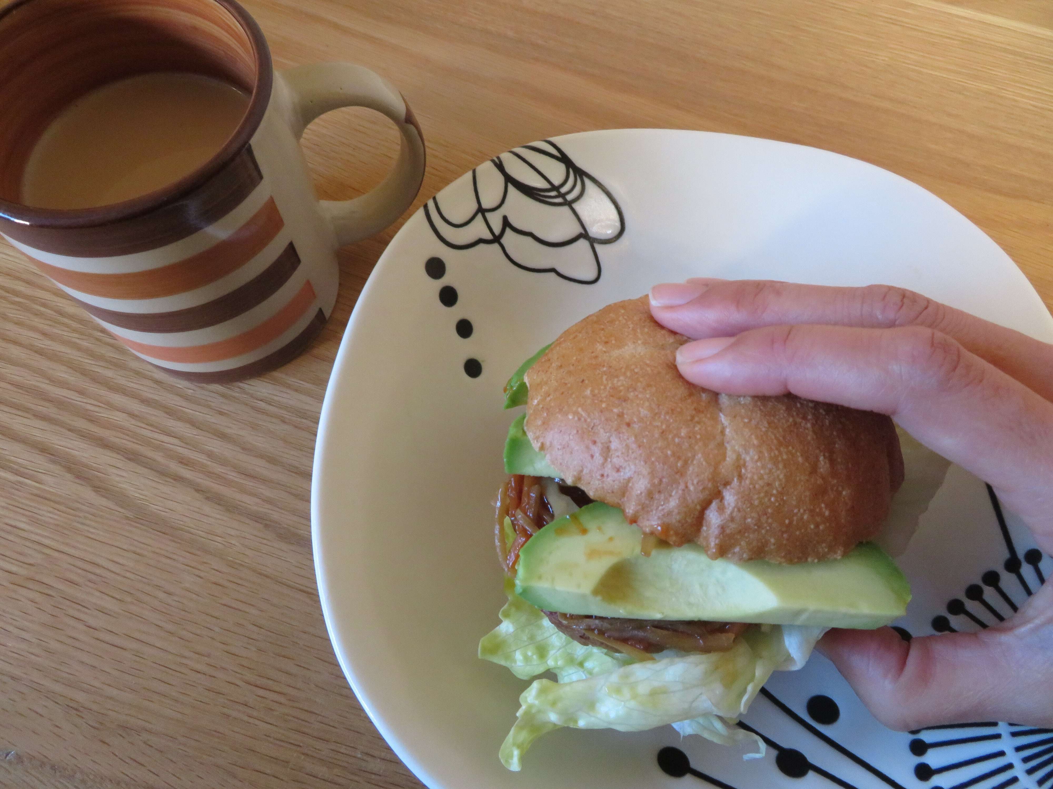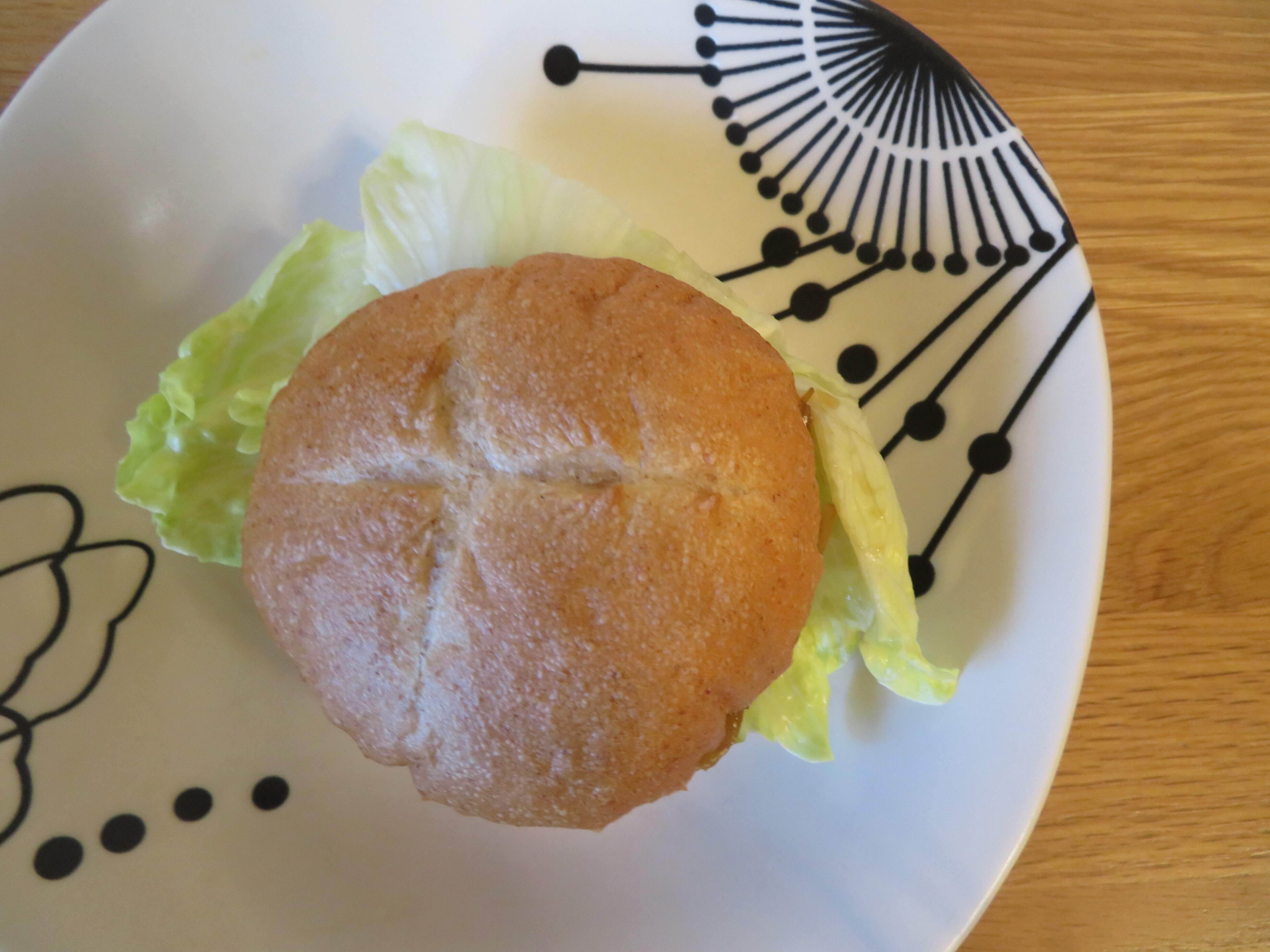 全粒粉のバンズがしっかりとした食感でかたさのある野菜も入っているので、ゆっくりかんで食べれば満足感を得られます。