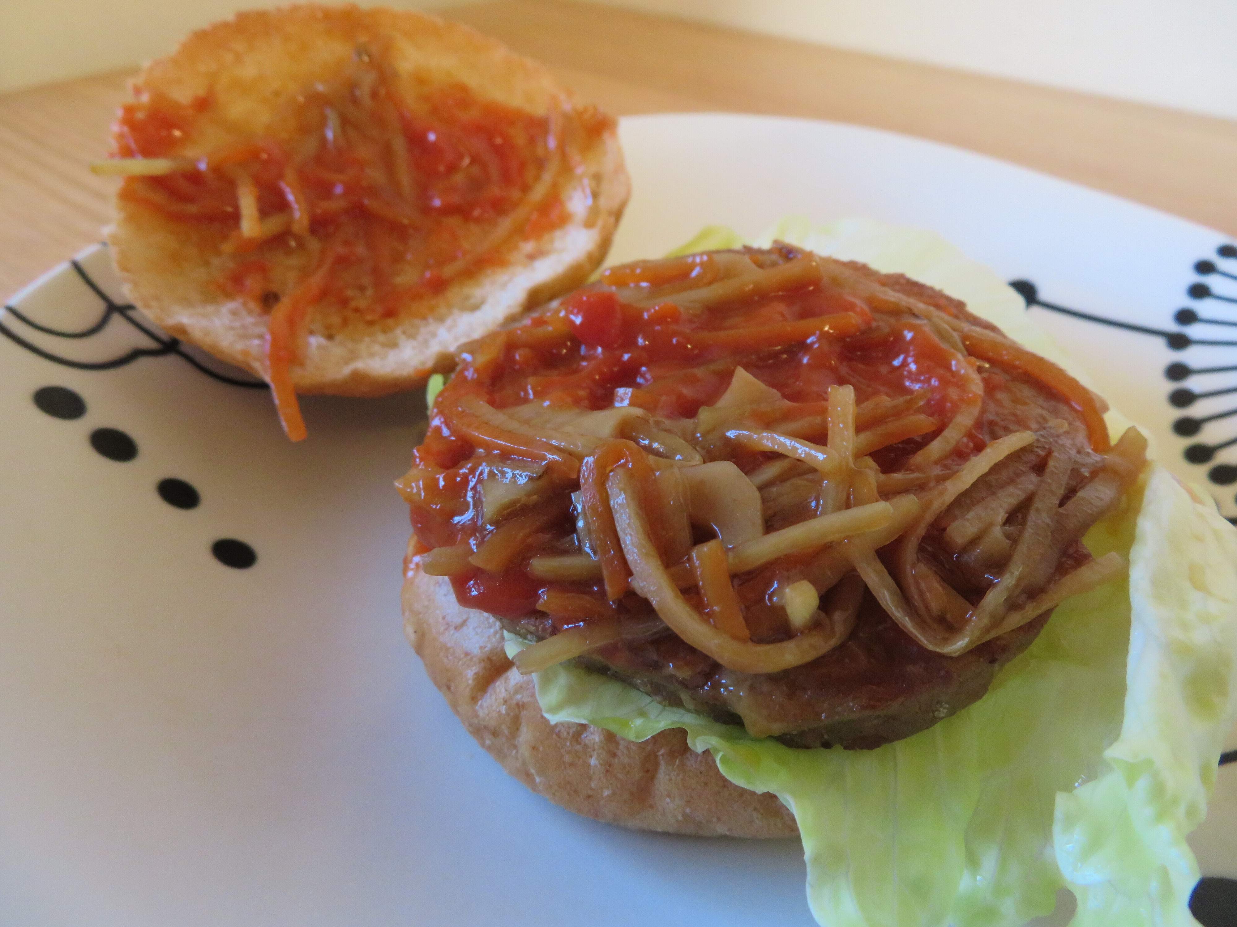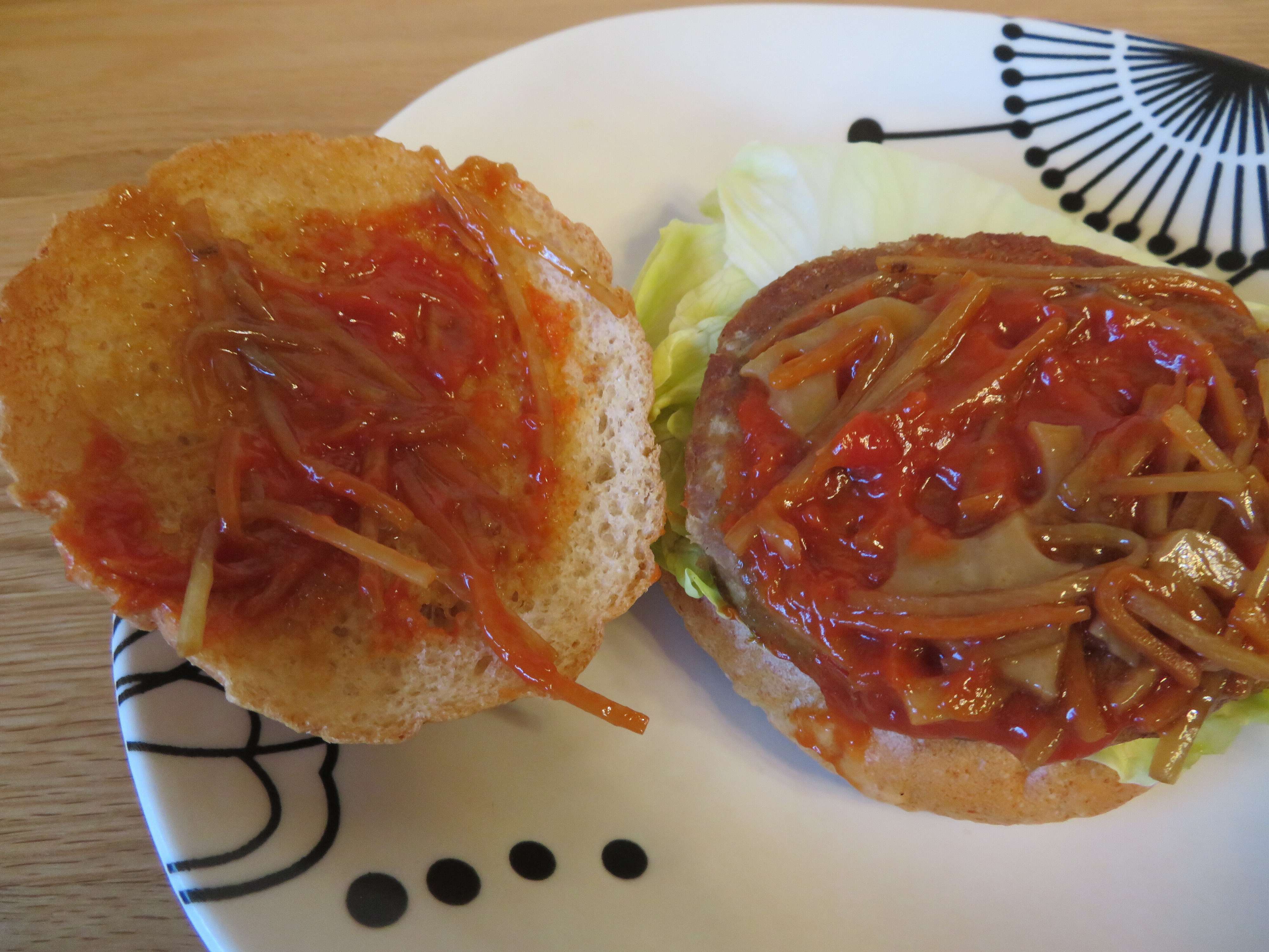 大豆ミートのハンバーグの上には、たっぷりのトマトソースとレンコン・ゴボウ・ニンジンのきんぴらがのっています。