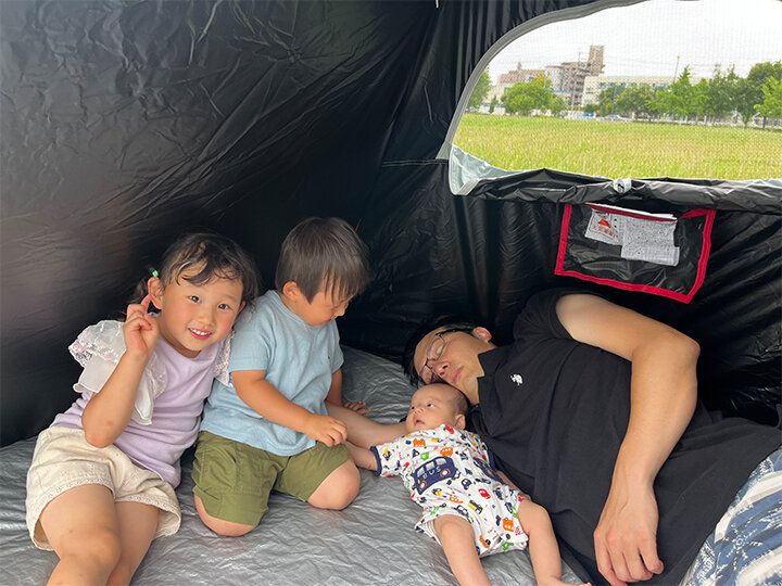 「軽いですね! 子ども連れのお出かけはとにかく荷物が多くなりがちですが、このテントは軽く背負えるから両手が空いて、子どもの手もつなげる」(榊山さん)